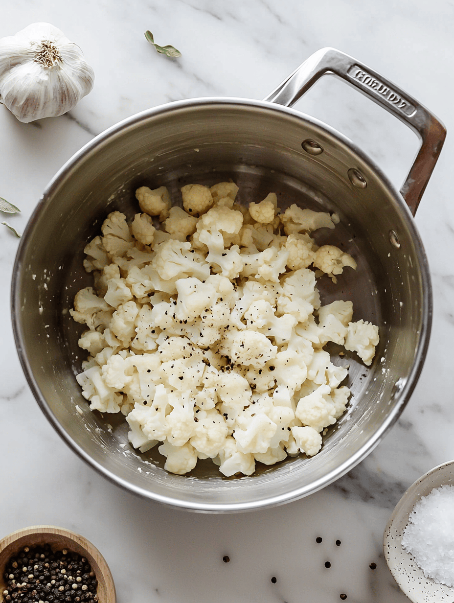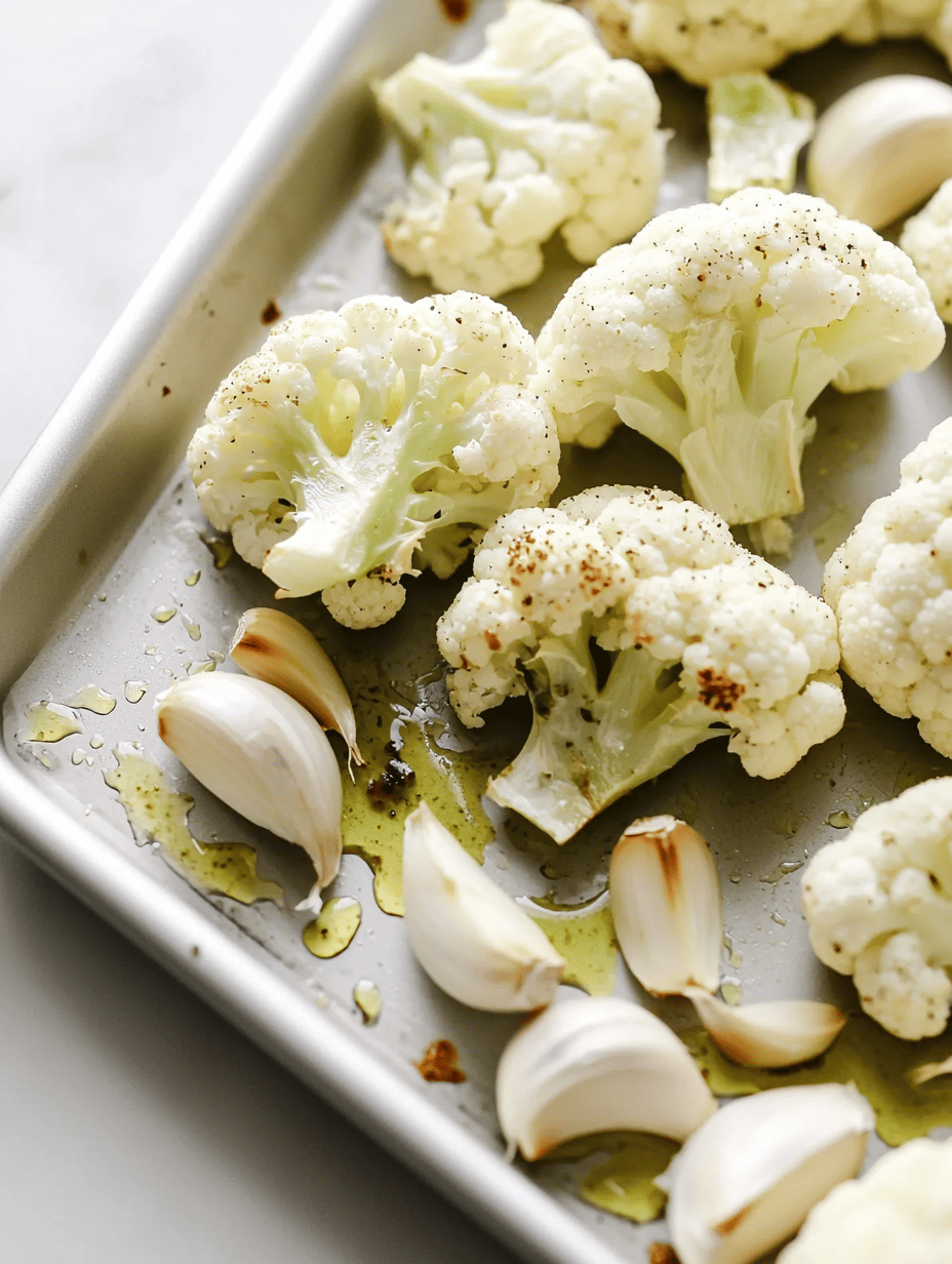 Preheat your oven to 425°F (220°C). Place cauliflower florets and whole garlic cloves on a baking sheet, then drizzle with olive oil and toss to coat evenly.