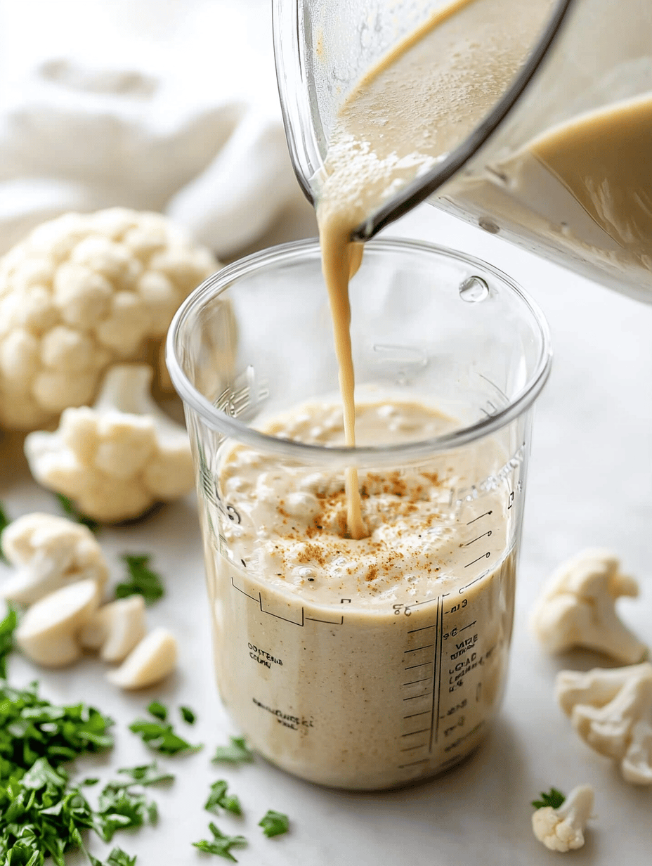 Squeeze the roasted garlic cloves out of their skins into a blender or directly into a large pot if using an immersion blender. Add the roasted cauliflower.