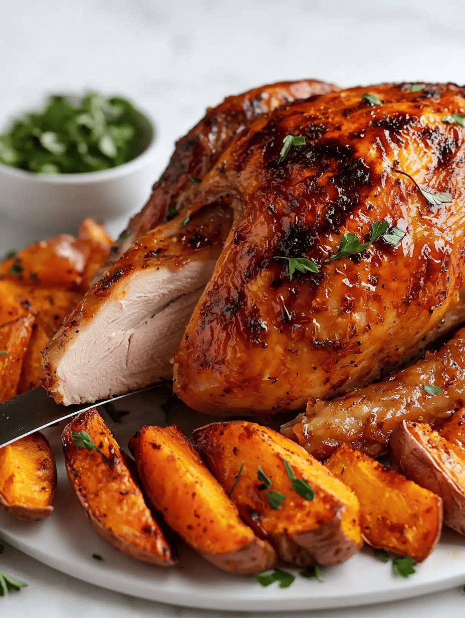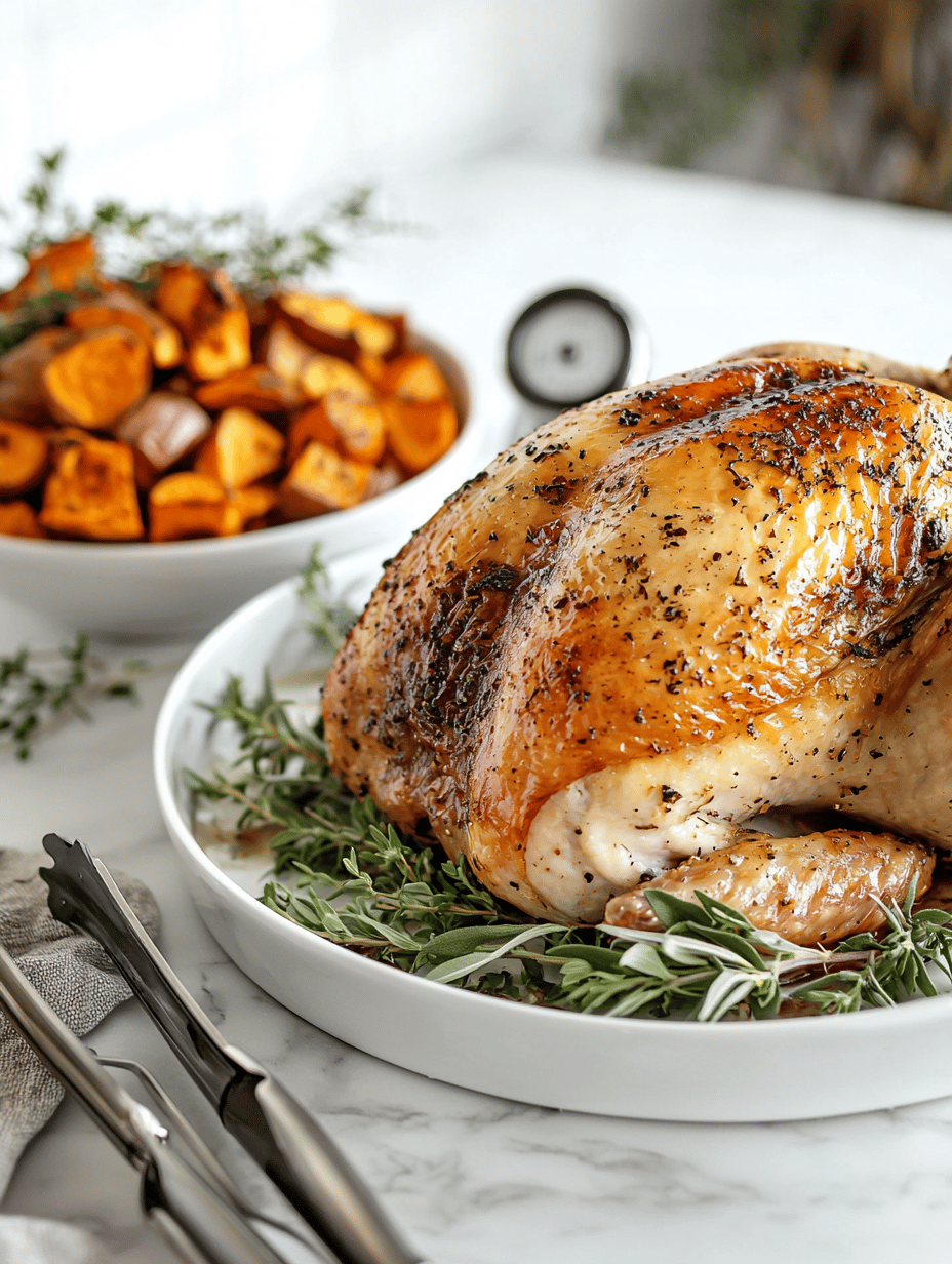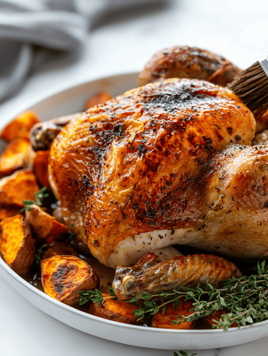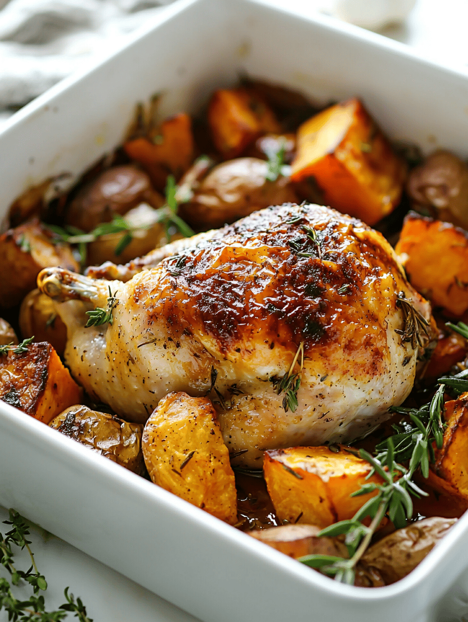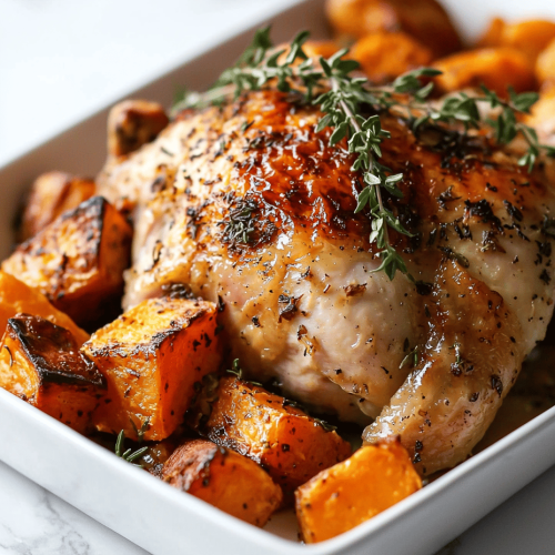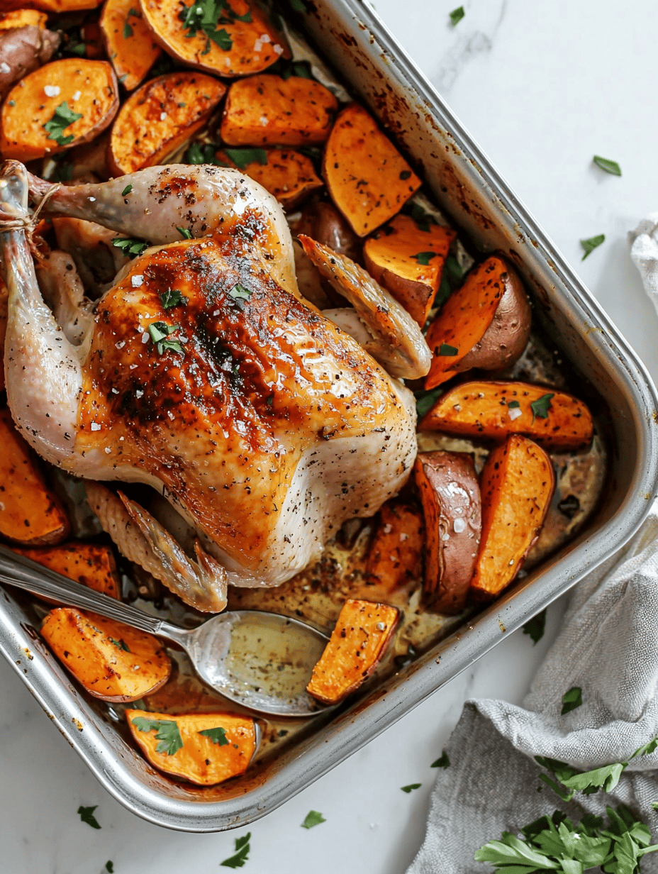 This dish features a whole chicken roasted alongside sweet potatoes, resulting in crispy-skinned poultry and tender, caramelized vegetables. The dish emphasizes oven roasting to develop rich flavors, with the crispy skin contrasting the soft, sweet interior of the potatoes, finished with fragrant herbs for an aromatic touch.