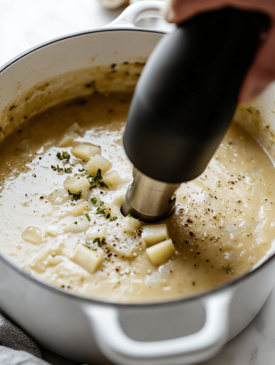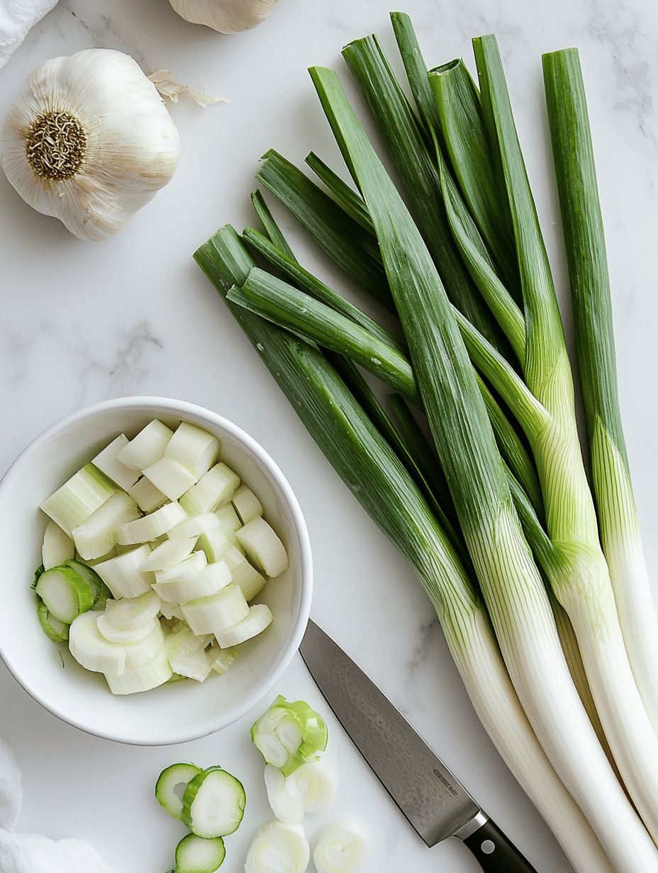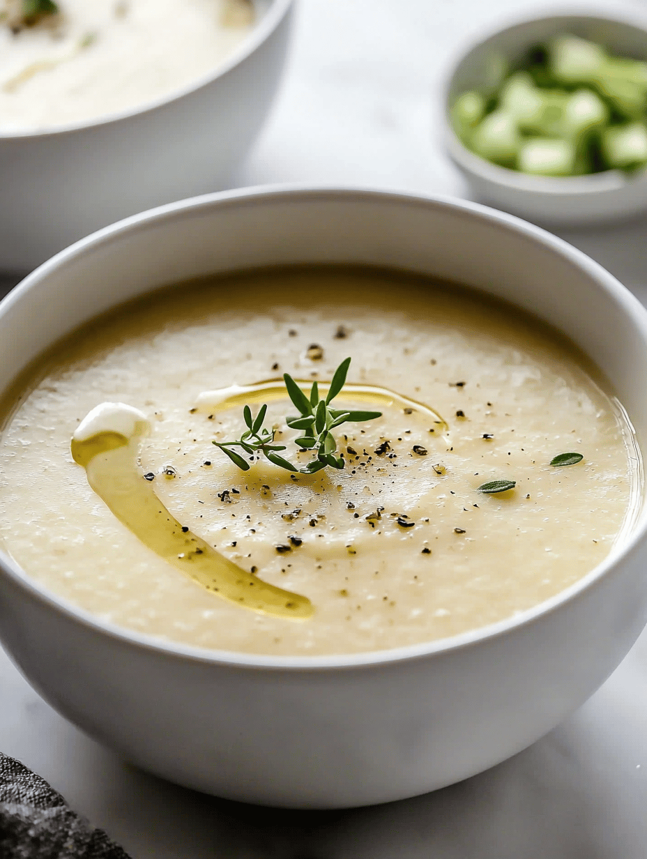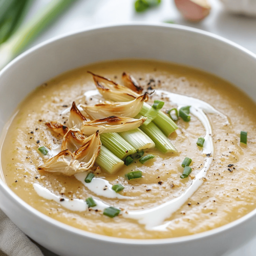 This soup features garlic and leeks that are slow-roasted to develop deep, caramelized flavors before being blended into a velvety, comfort-food broth. The roasting process transforms simple ingredients into a rich, aromatic dish with a smooth texture and golden hue, perfect for cozy evenings.