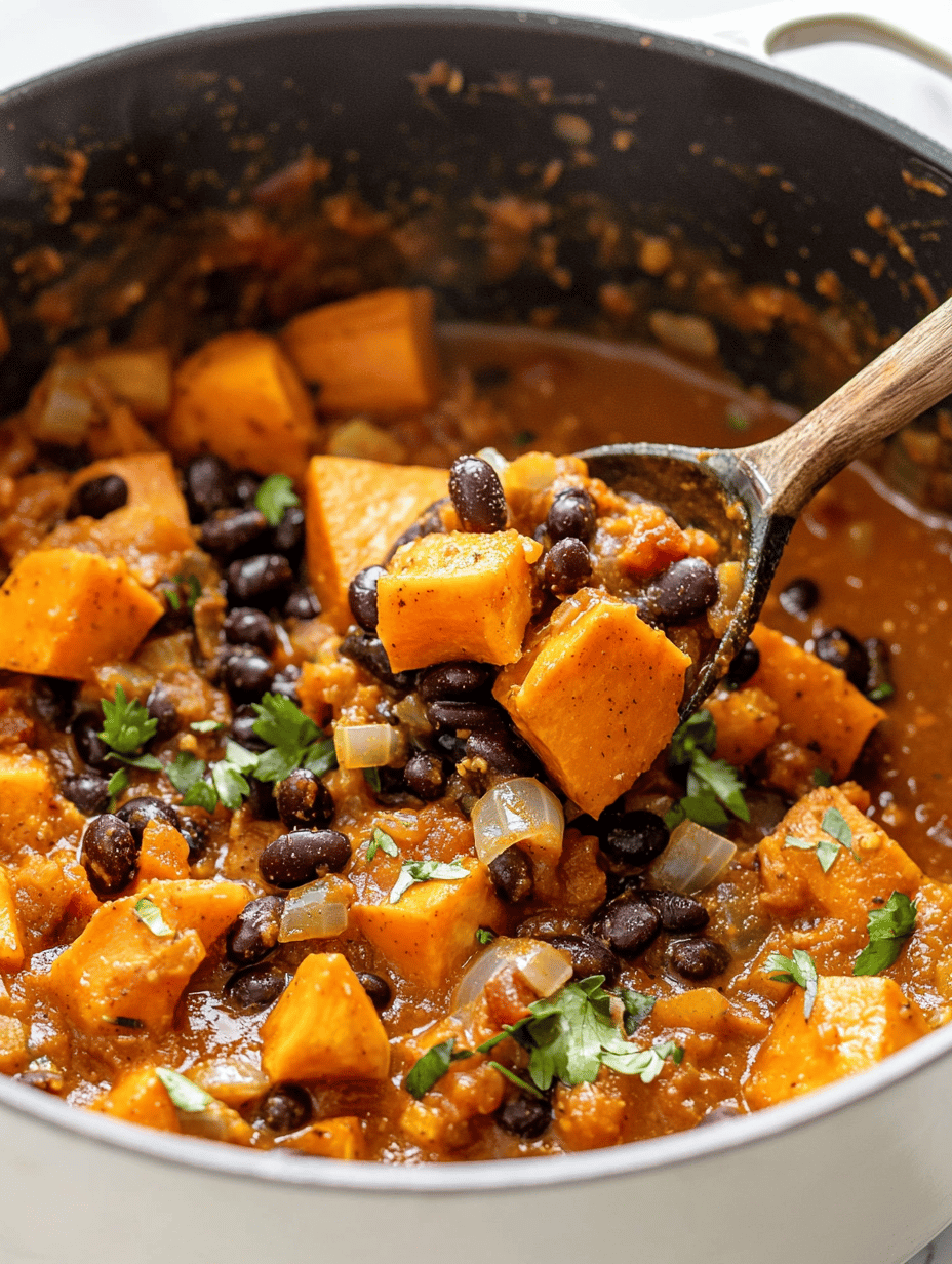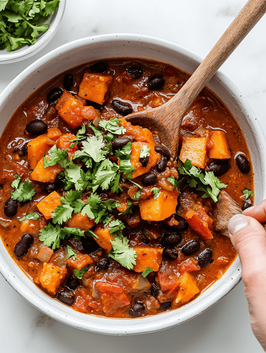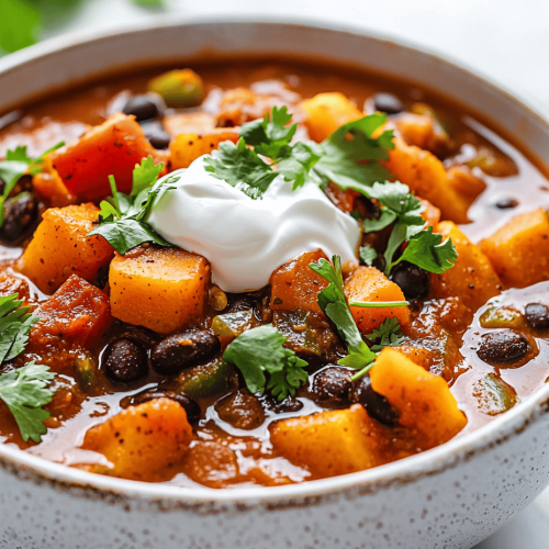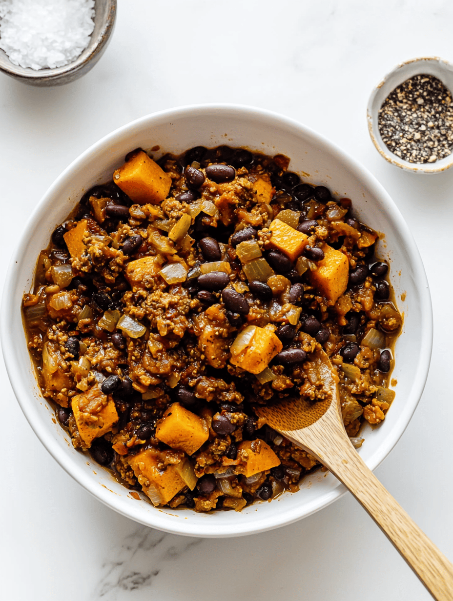 This dish is a hearty chili made with roasted pumpkin, black beans, and warm spices. The pumpkin is caramelized in the oven, then simmered with beans and spices, resulting in a thick, flavorful, and slightly smoky stew with a vibrant color and comforting texture.