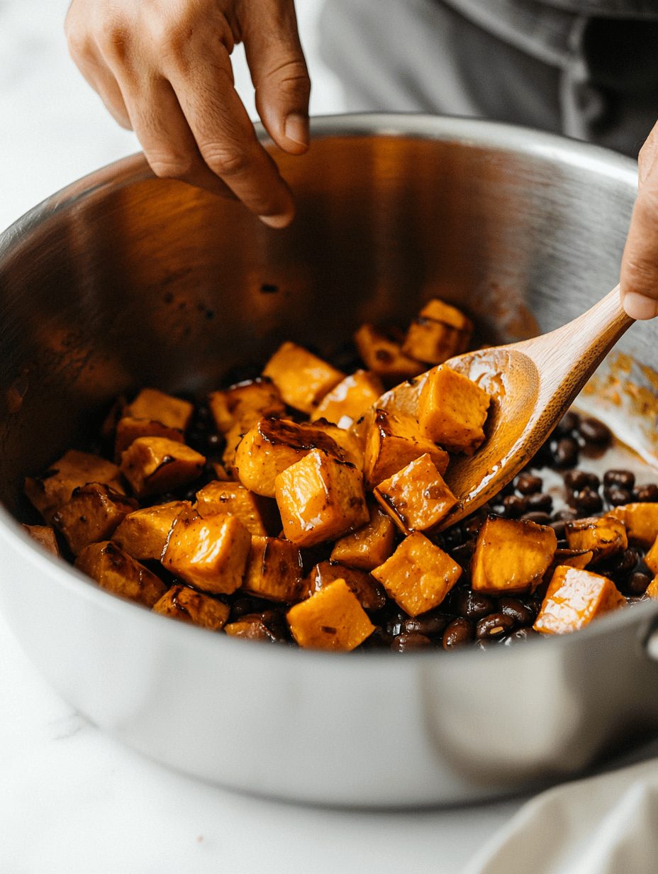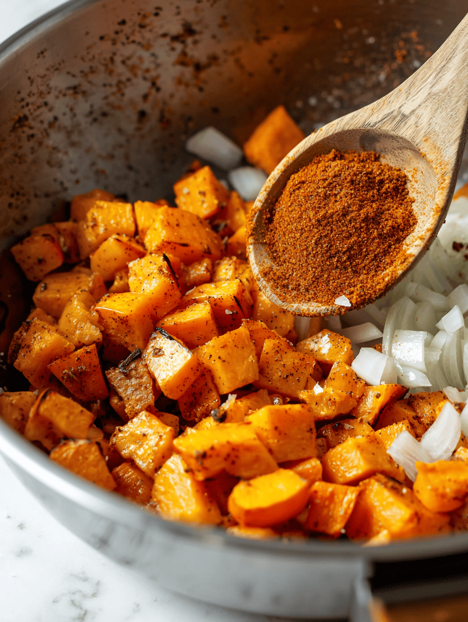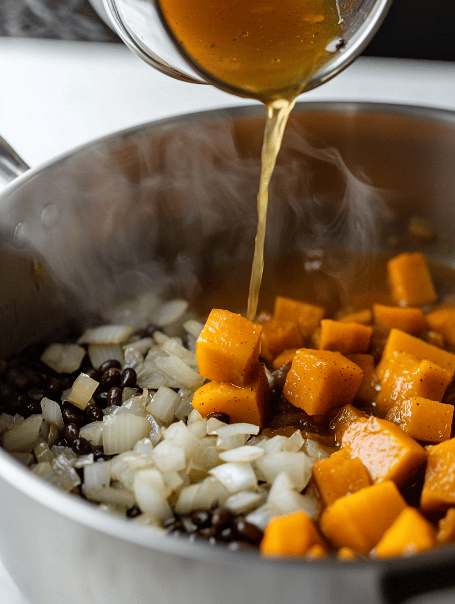 This dish is a hearty chili made with roasted pumpkin, black beans, and warm spices. The pumpkin is caramelized in the oven, then simmered with beans and spices, resulting in a thick, flavorful, and slightly smoky stew with a vibrant color and comforting texture.