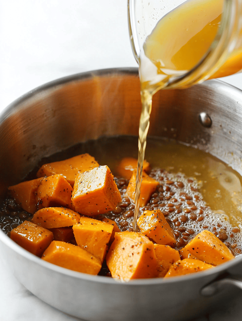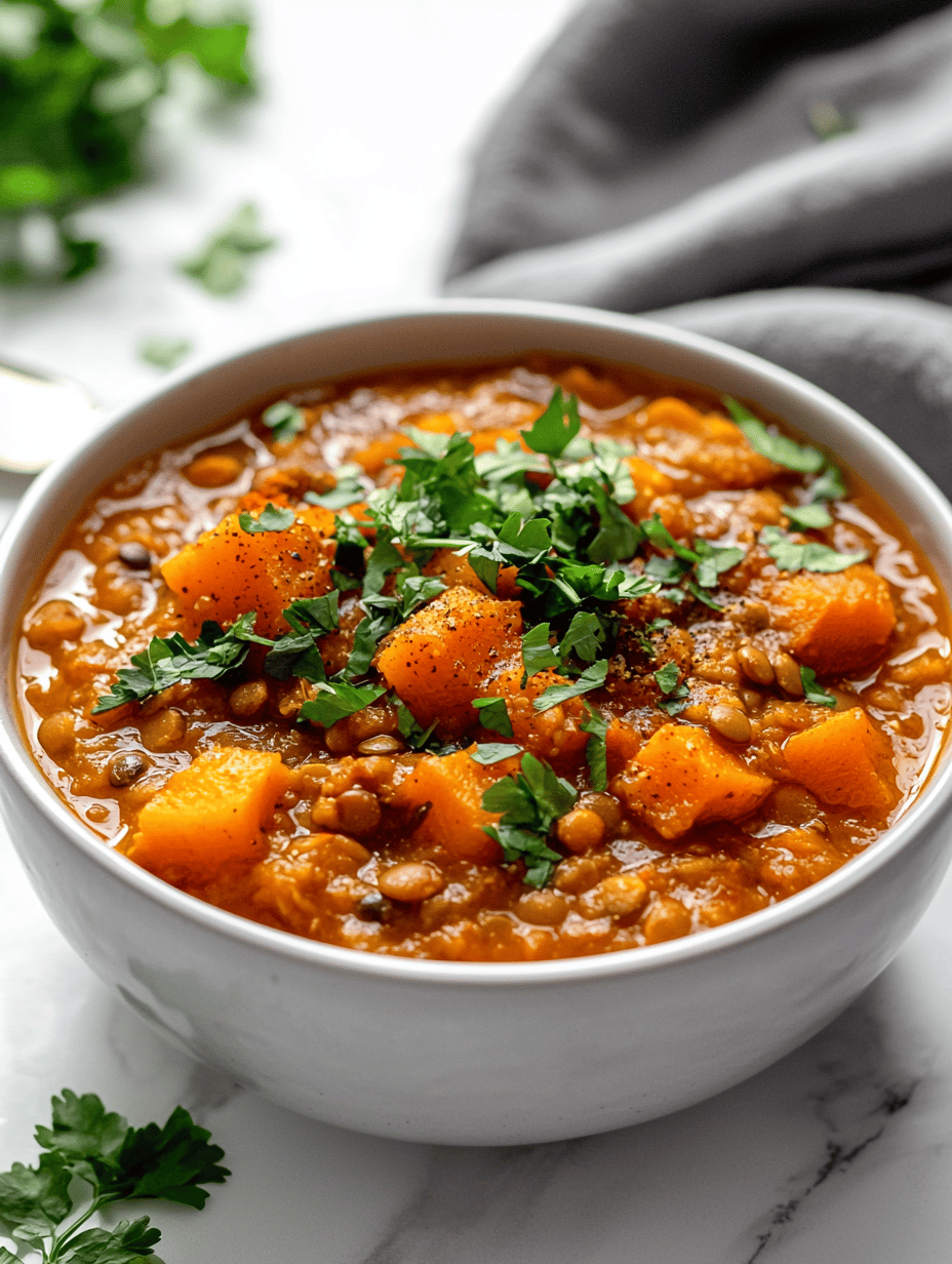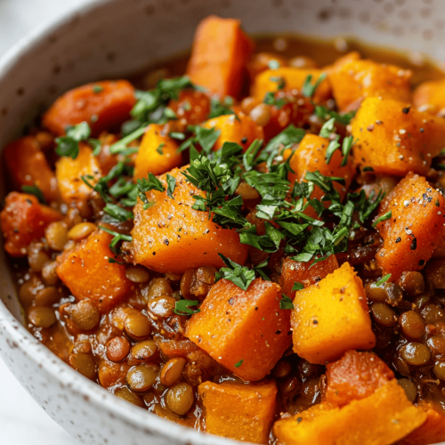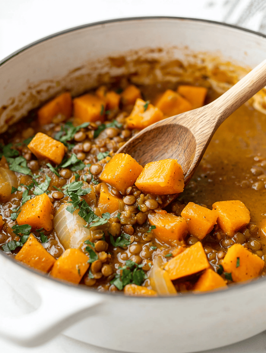 This hearty stew combines creamy roasted pumpkin with tender lentils, simmered with warm spices until thick and flavorful. The final dish has a comforting, velvety texture with a rich, earthy aroma that embodies seasonal fall flavors.