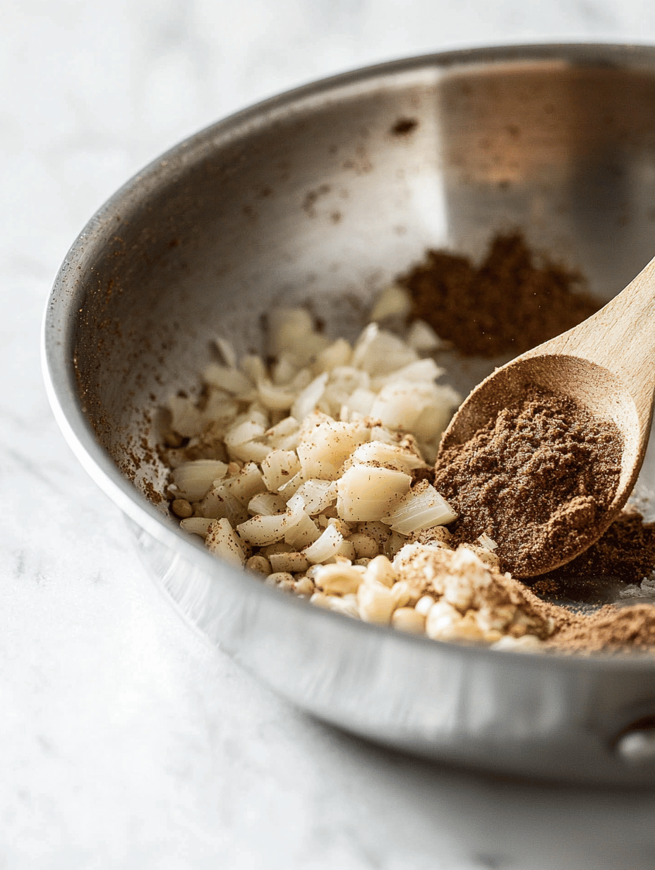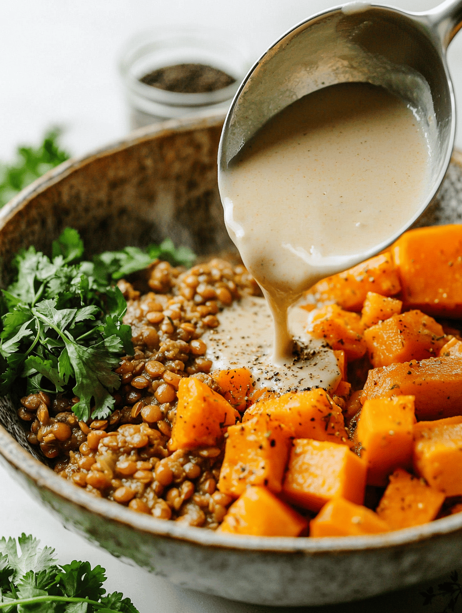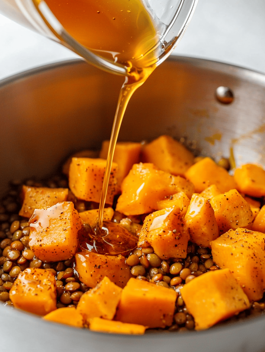 This hearty stew combines creamy roasted pumpkin with tender lentils, simmered with warm spices until thick and flavorful. The final dish has a comforting, velvety texture with a rich, earthy aroma that embodies seasonal fall flavors.