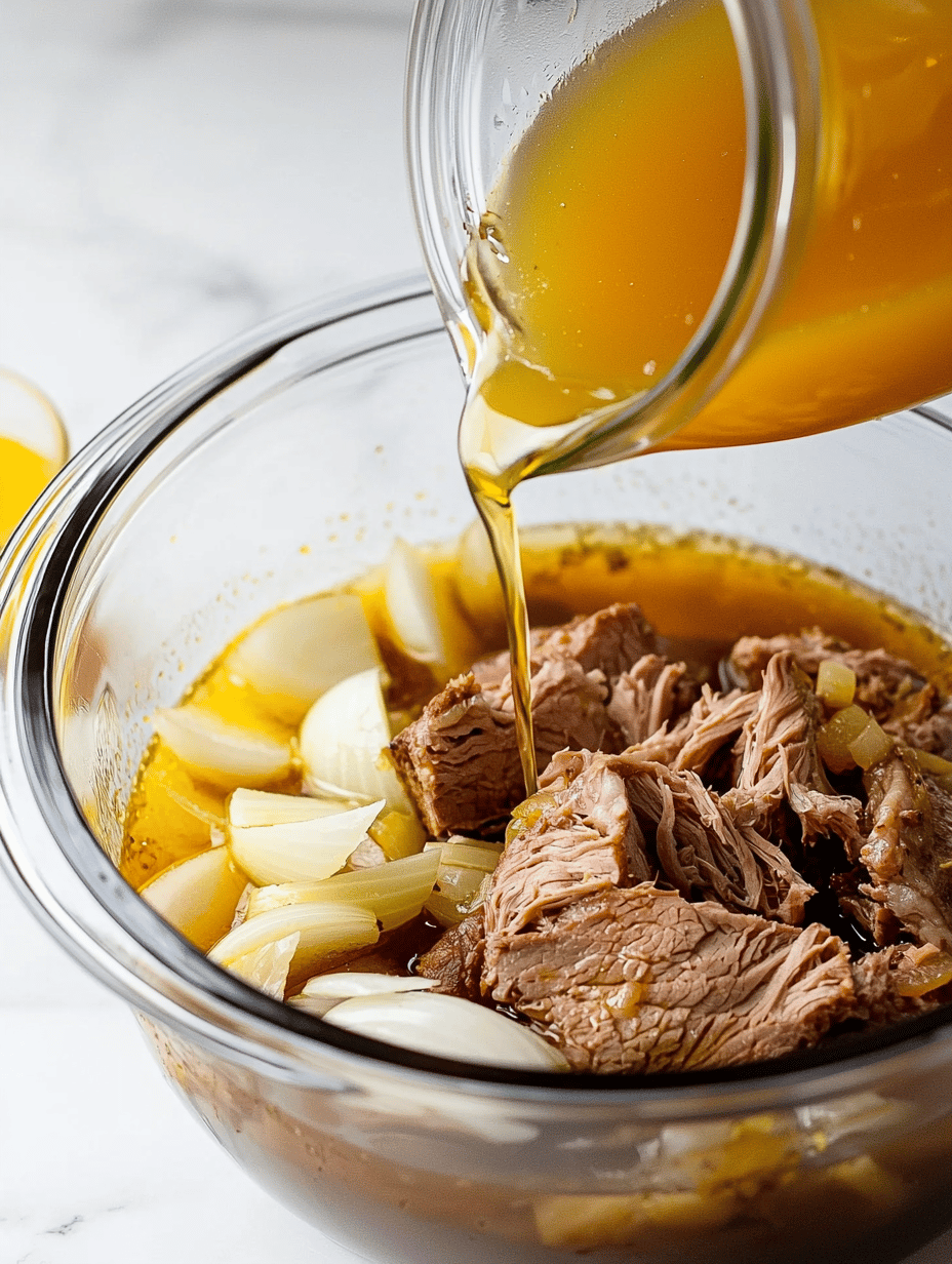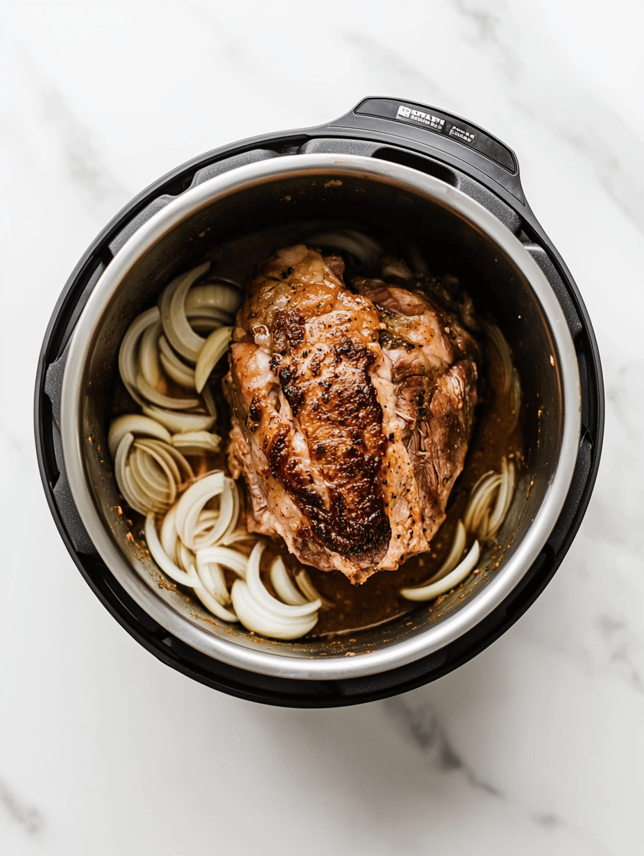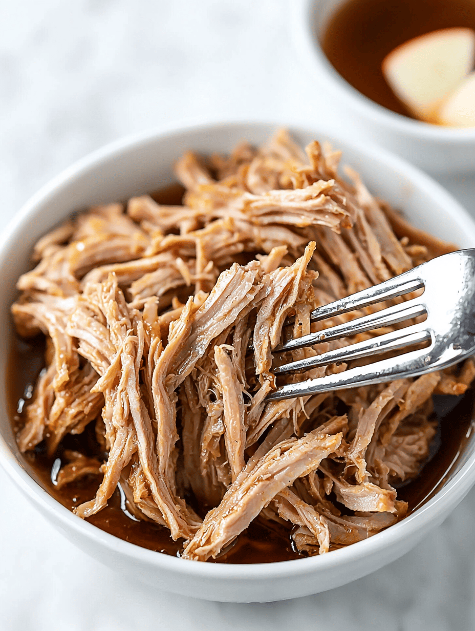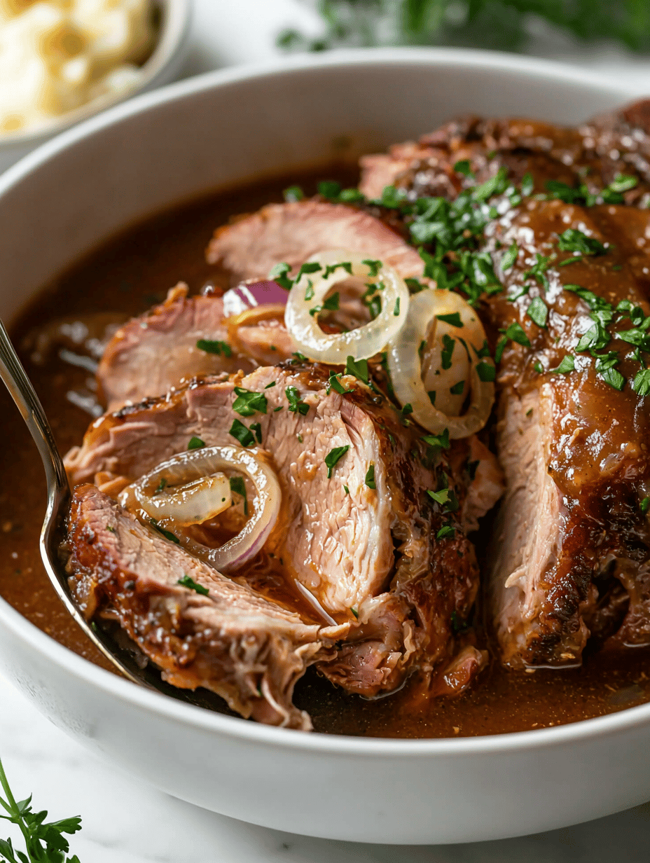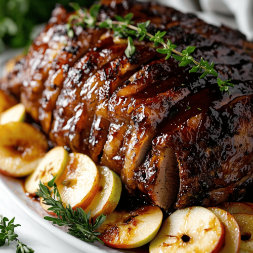 This dish involves browning a pork roast then slow-cooking it in a mixture of apple cider and spices. The pork becomes tender and fall-apart soft, with a flavorful, slightly caramelized exterior, and the cider creates a rich, aromatic sauce surrounding the meat.