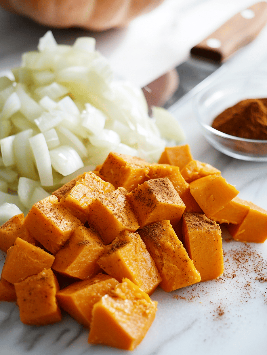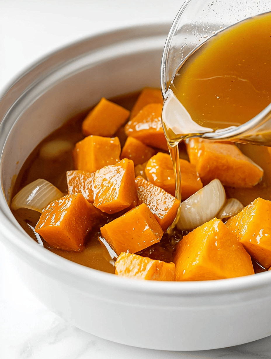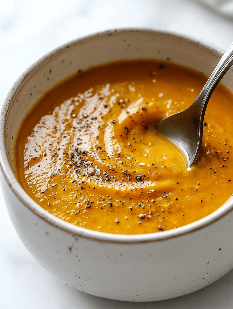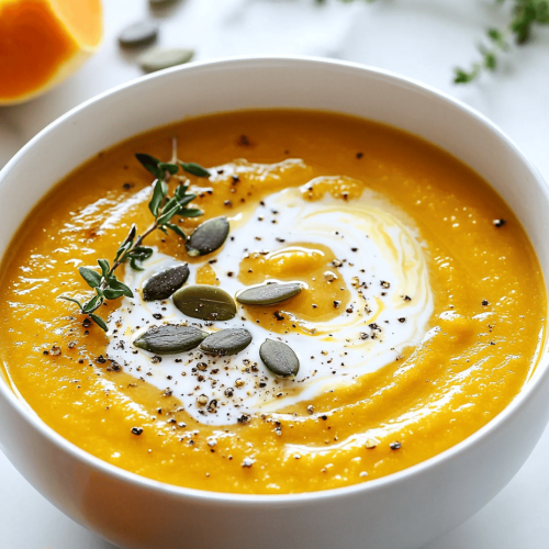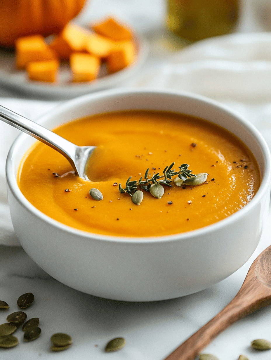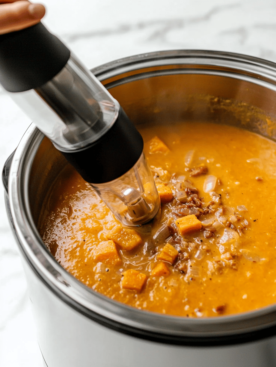 This pumpkin soup is made by slow-cooking chunks of pumpkin along with aromatic spices in a crockpot, resulting in a rich and velvety texture. The finished soup has a smooth consistency with a warm, inviting orange hue, often garnished with toasted pumpkin seeds for crunch. The preparation involves sautéing aromatics, slow-cooking to meld flavors, and blending to a creamy finish.