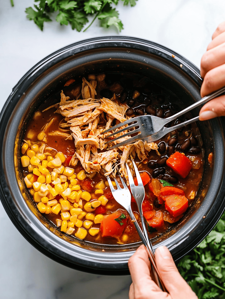 Once cooked, shred the chicken with two forks directly in the slow cooker, allowing it to soak up the flavorful broth.