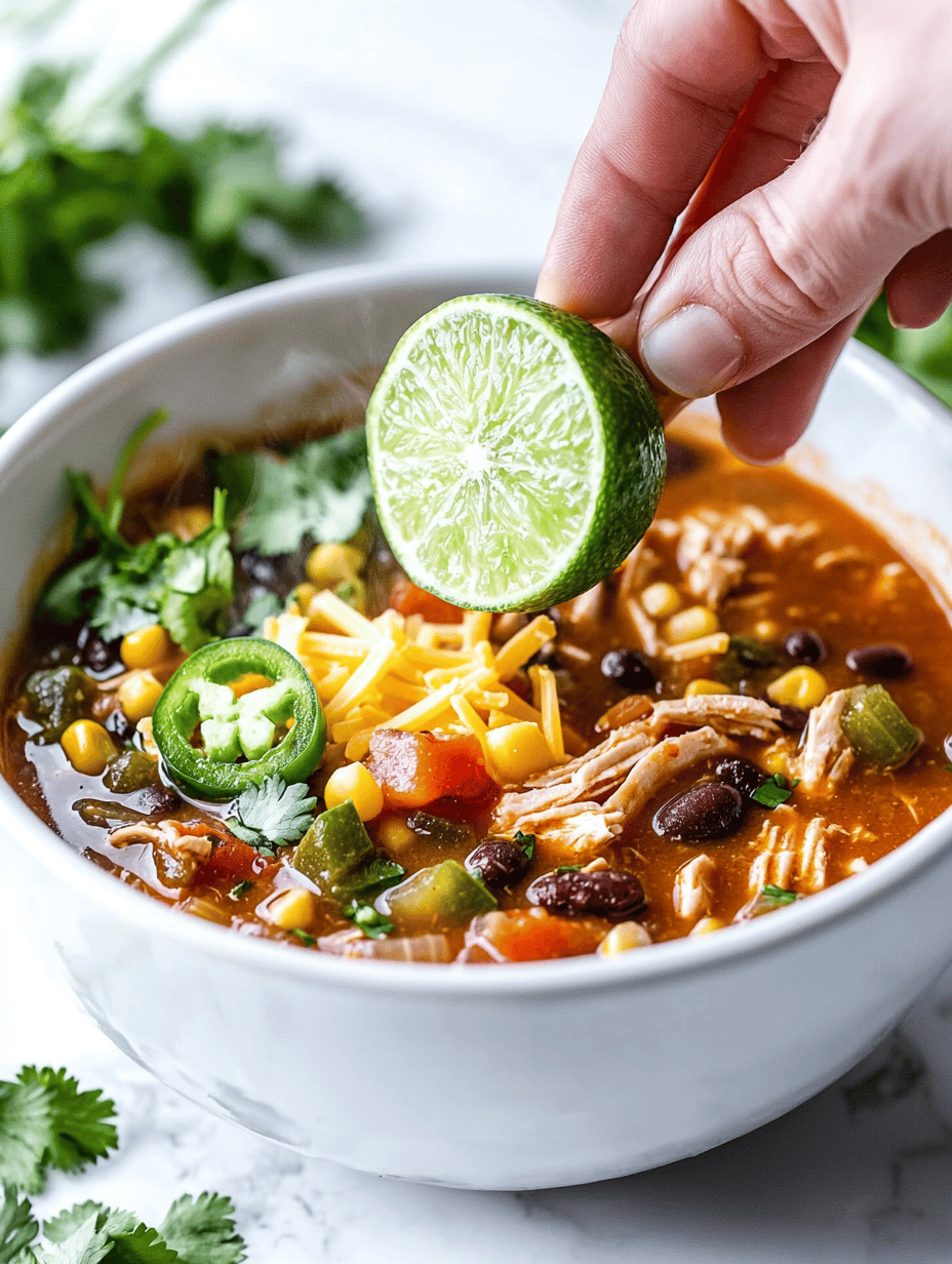 Squeeze fresh lime juice into the soup, stirring well to brighten the flavors. Adjust seasoning with salt and pepper if needed.