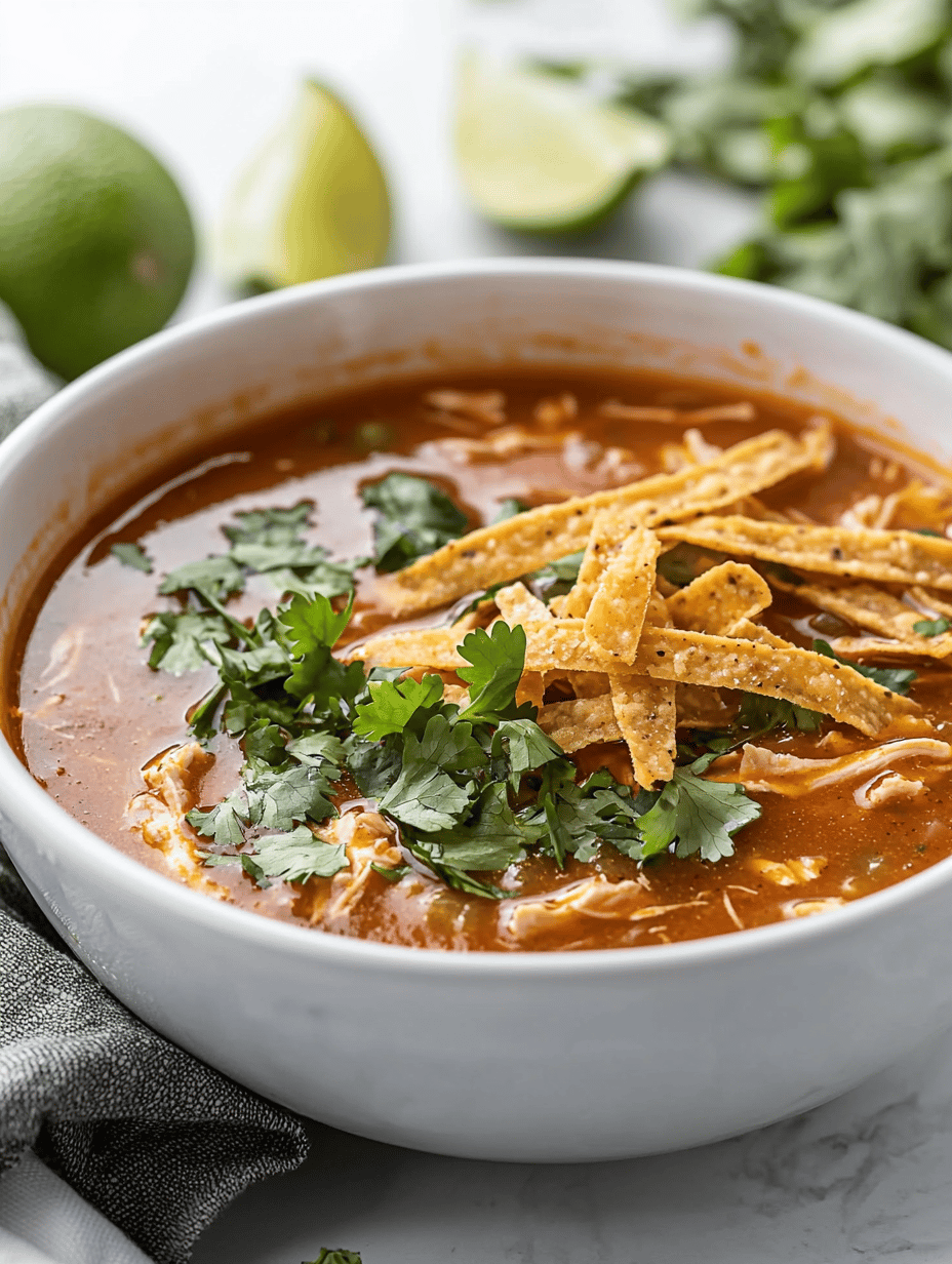 Ladle the hot soup into bowls, then top each with a handful of crispy tortilla strips and chopped cilantro. Serve immediately with lime wedges on the side.
