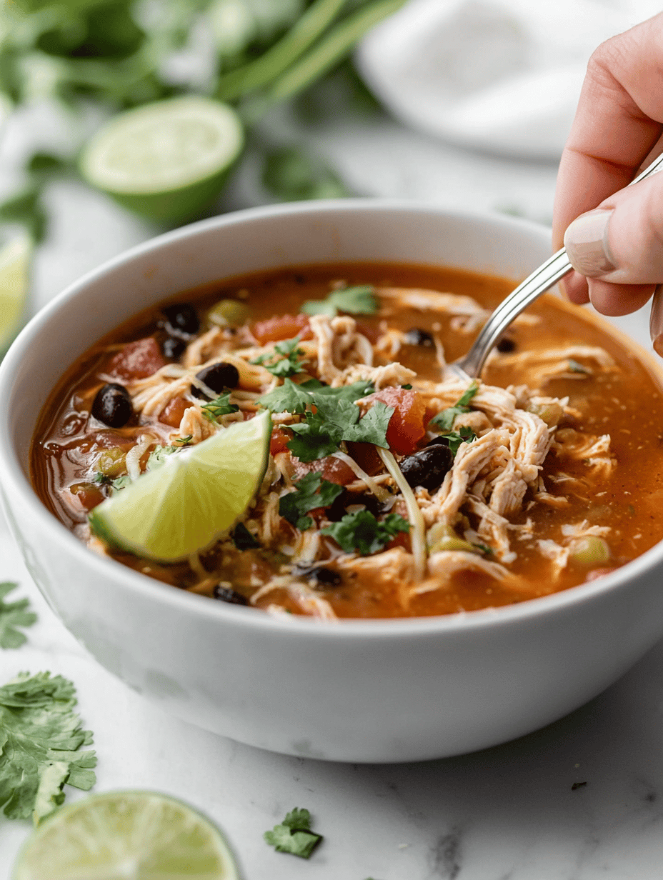 This chicken tortilla soup is made by slow-cooking chicken, peppers, and spices until tender, then blending flavors into a hearty, spicy broth. It features shredded chicken, roasted vegetables, and crispy tortilla strips, resulting in a comforting mixture with a slightly chunky texture and vibrant appearance. The final presentation is both rustic and colorful, topped with fresh herbs and crunchy toppings.