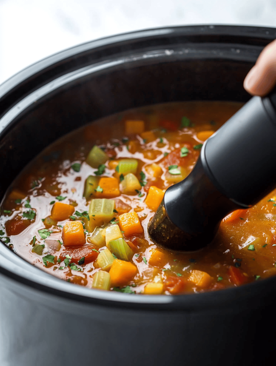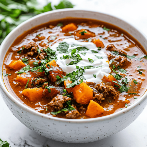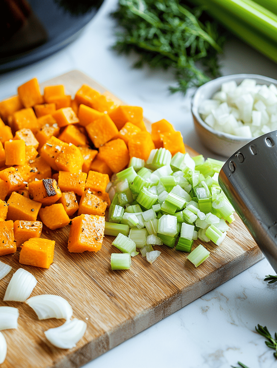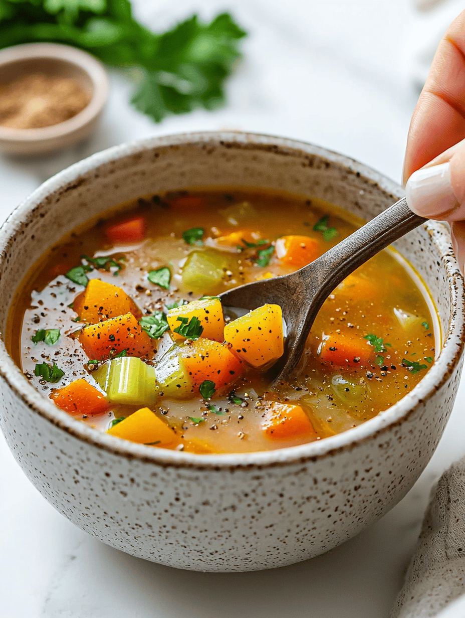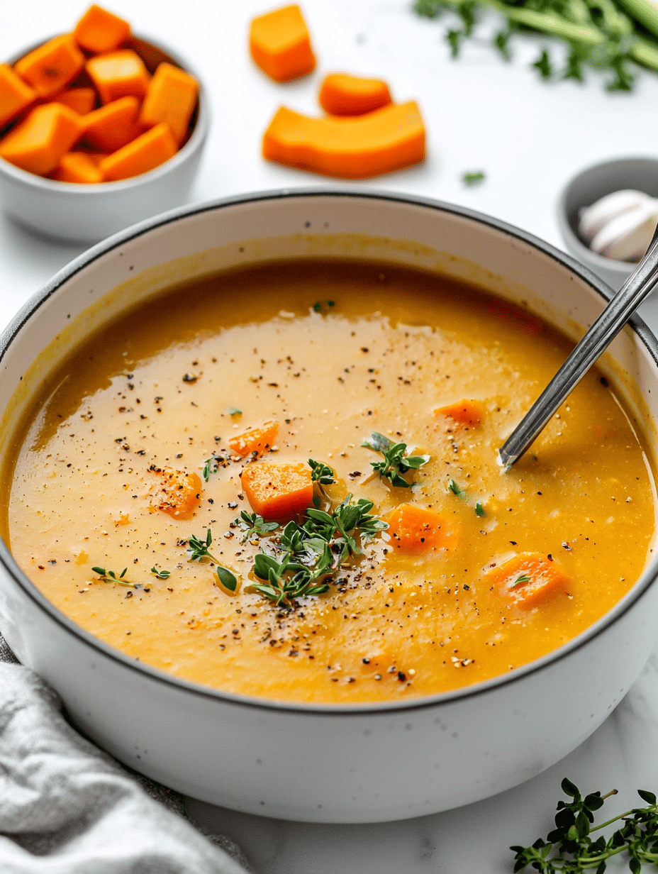 This fall-inspired soup is made by slow cooking a mixture of caramelized squash, root vegetables, and aromatic herbs until tender and velvety. The final dish has a smooth, thick broth with vibrant seasonal flavors and a fragrant, comforting aroma. It features a hearty texture with soft vegetables infused with spices, perfect for cozy meals.