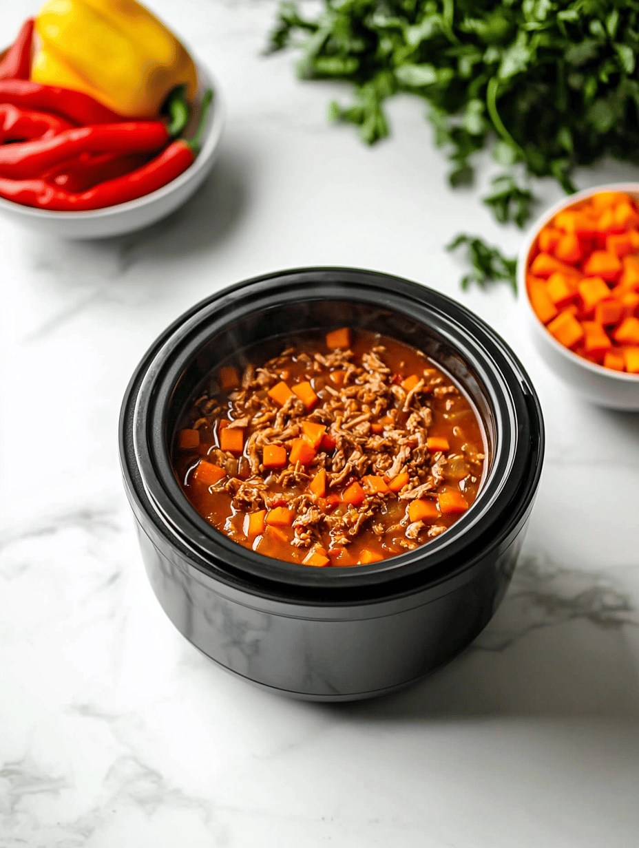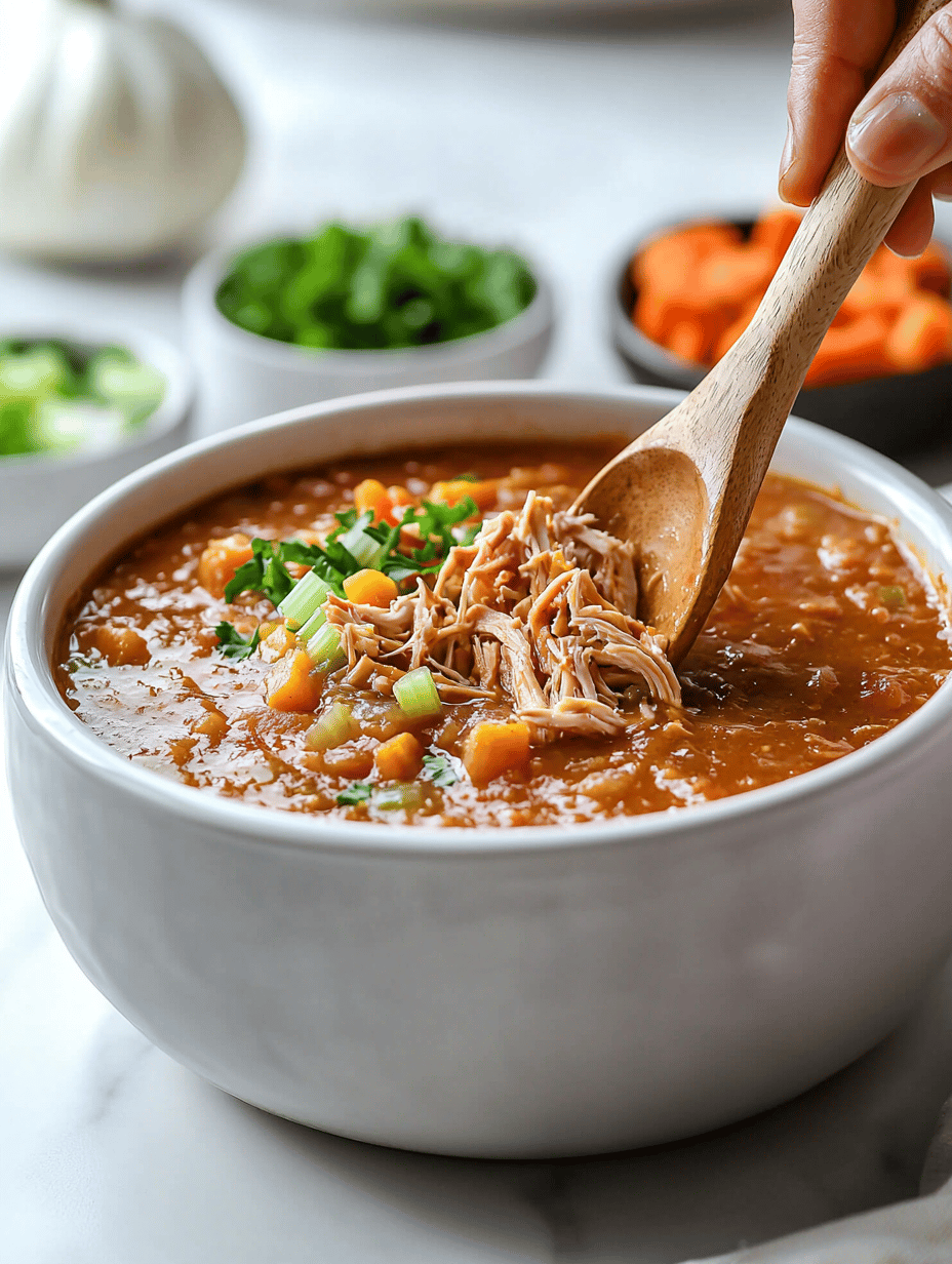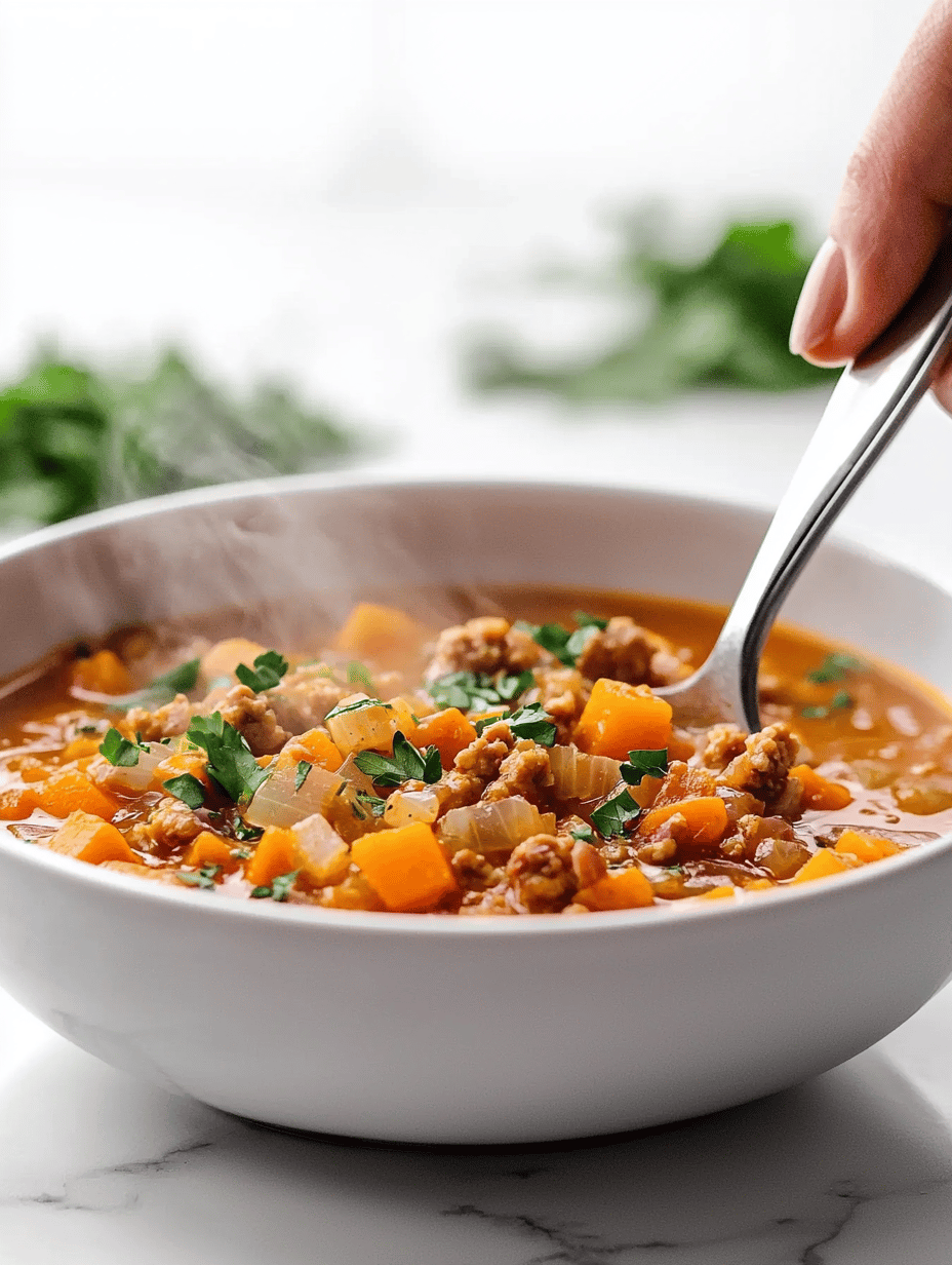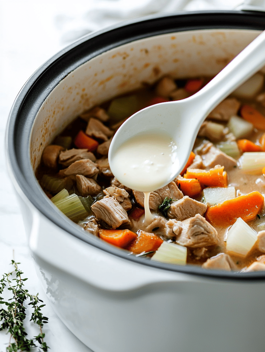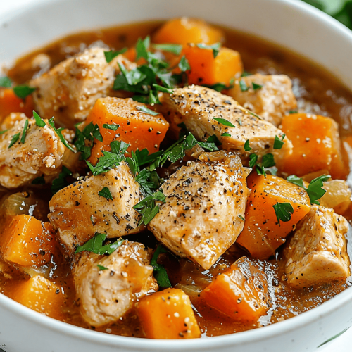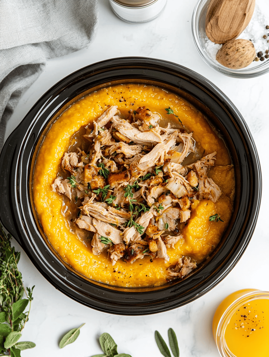 This stew combines tender turkey with creamy pumpkin, simmered gently in a slow cooker to develop rich, comforting flavors. The dish results in a velvety, hearty soup with chunks of turkey and pumpkin that are both soft and satisfying, with a fragrant spice profile and a slightly thickened texture.