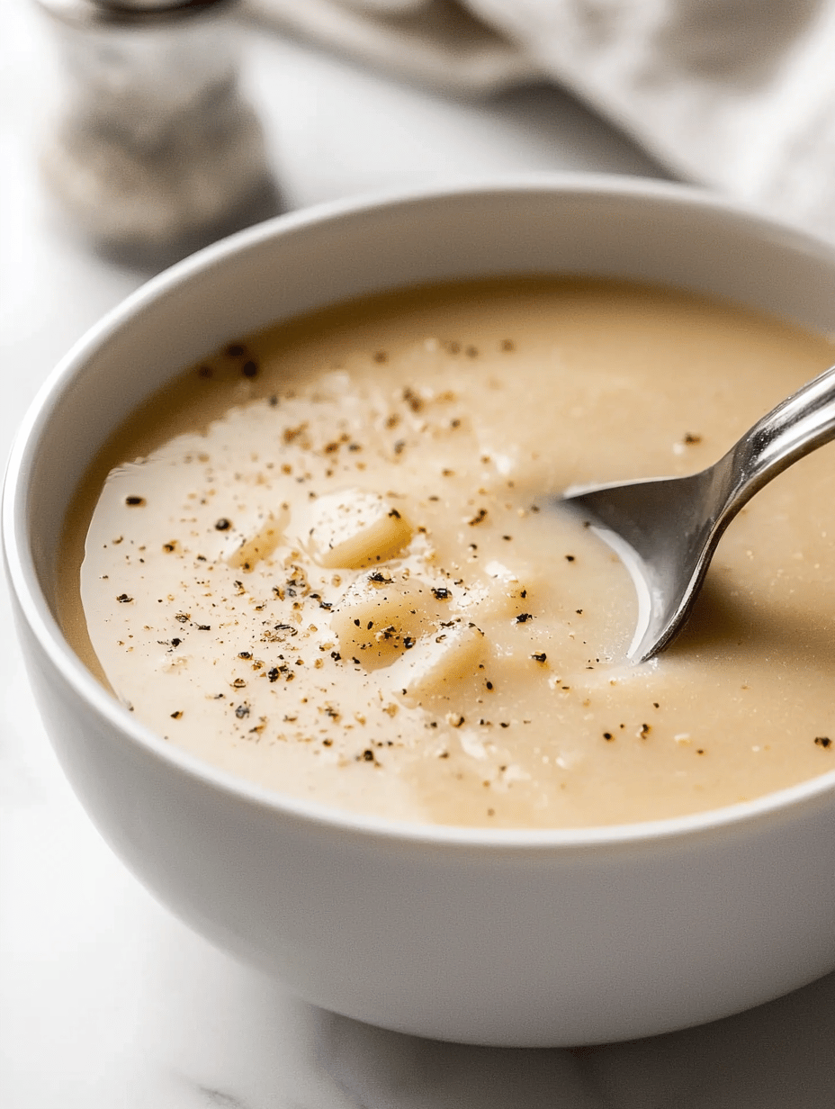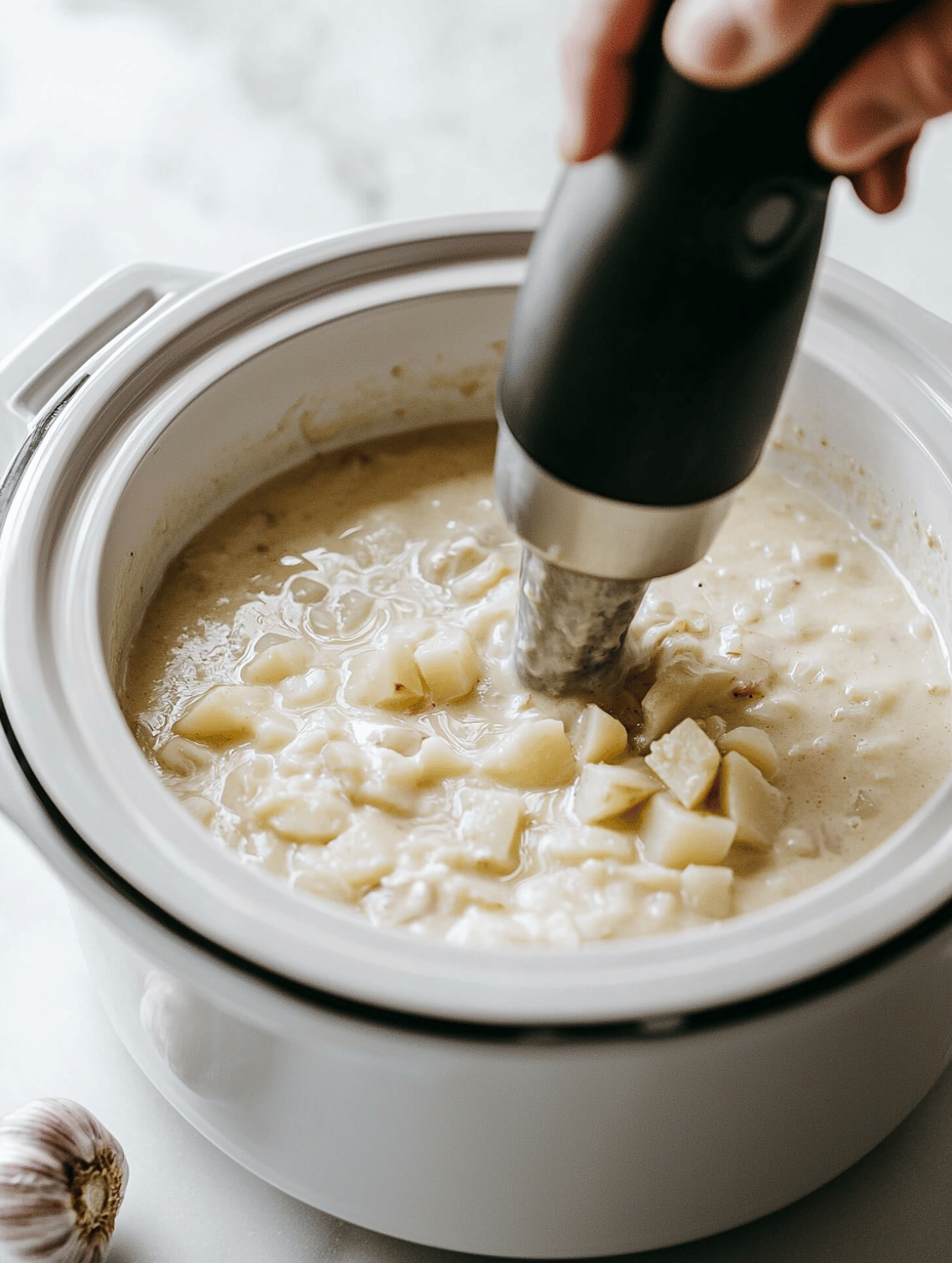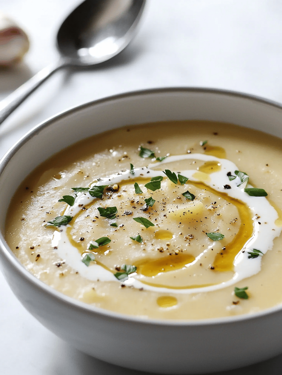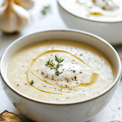 This soup features whole potatoes and garlic roasted slowly to develop rich, caramelized flavors. Prepared in a slow cooker, the ingredients transform into a smooth, velvety puree with a comforting, thick texture and deep roasted garlic aroma. The final dish is creamy and visually inviting, perfect for cozy gatherings.