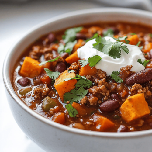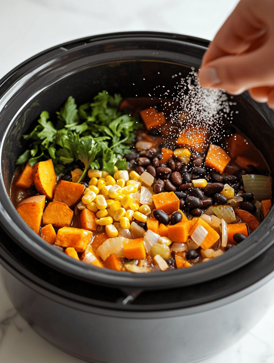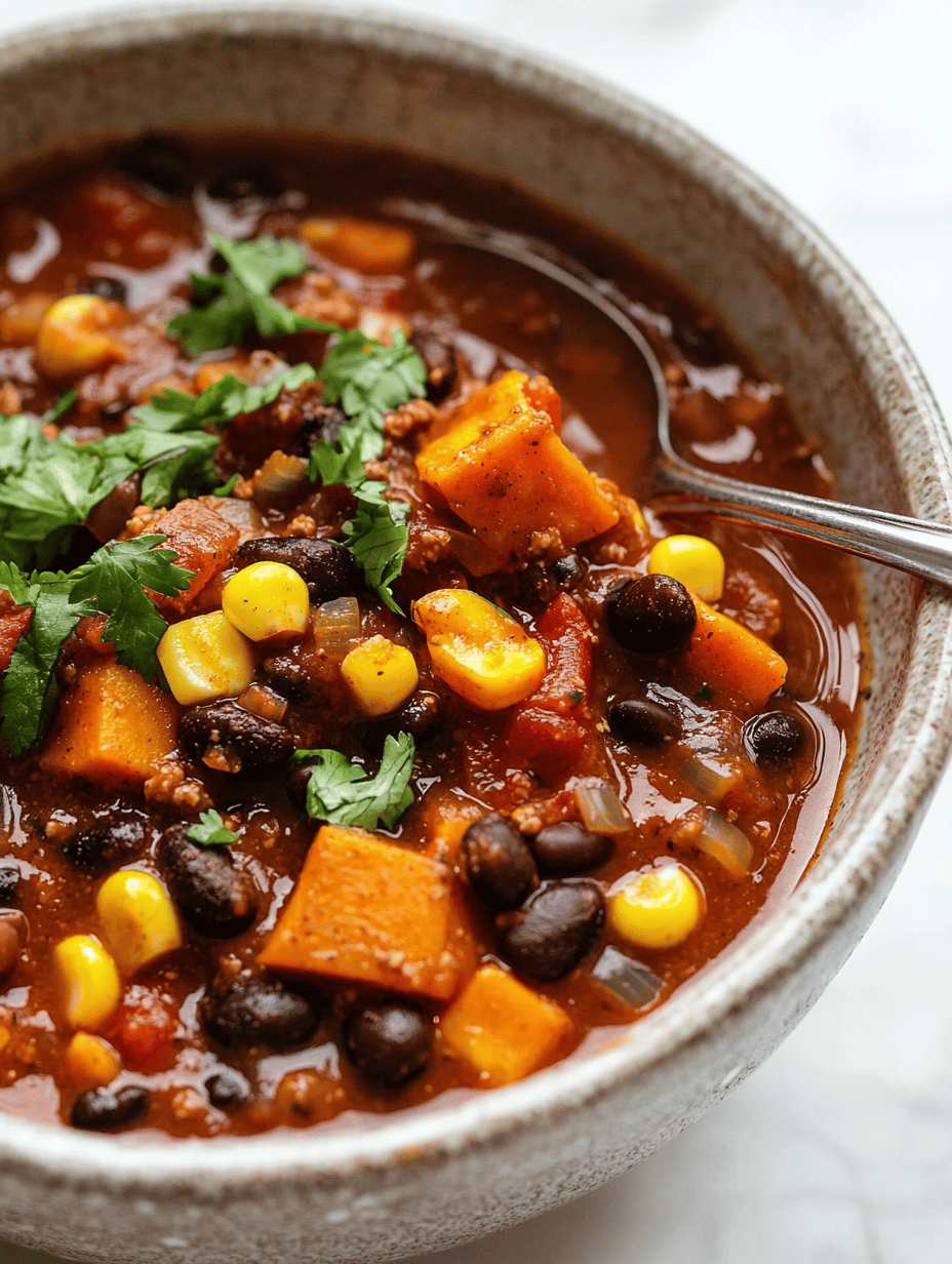This dish combines sweet potatoes, beans, and spices cooked slowly in a crockpot to create a hearty, thick chili with a vibrant color and satisfying texture. The ingredients meld together after several hours, resulting in a comforting, visually appealing bowl with tender vegetables and rich flavors.