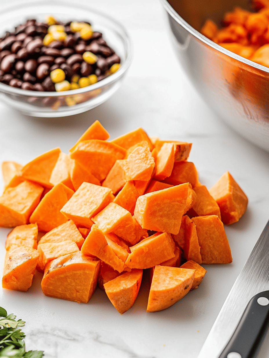 Dice the peeled sweet potatoes into bite-sized cubes and set aside.