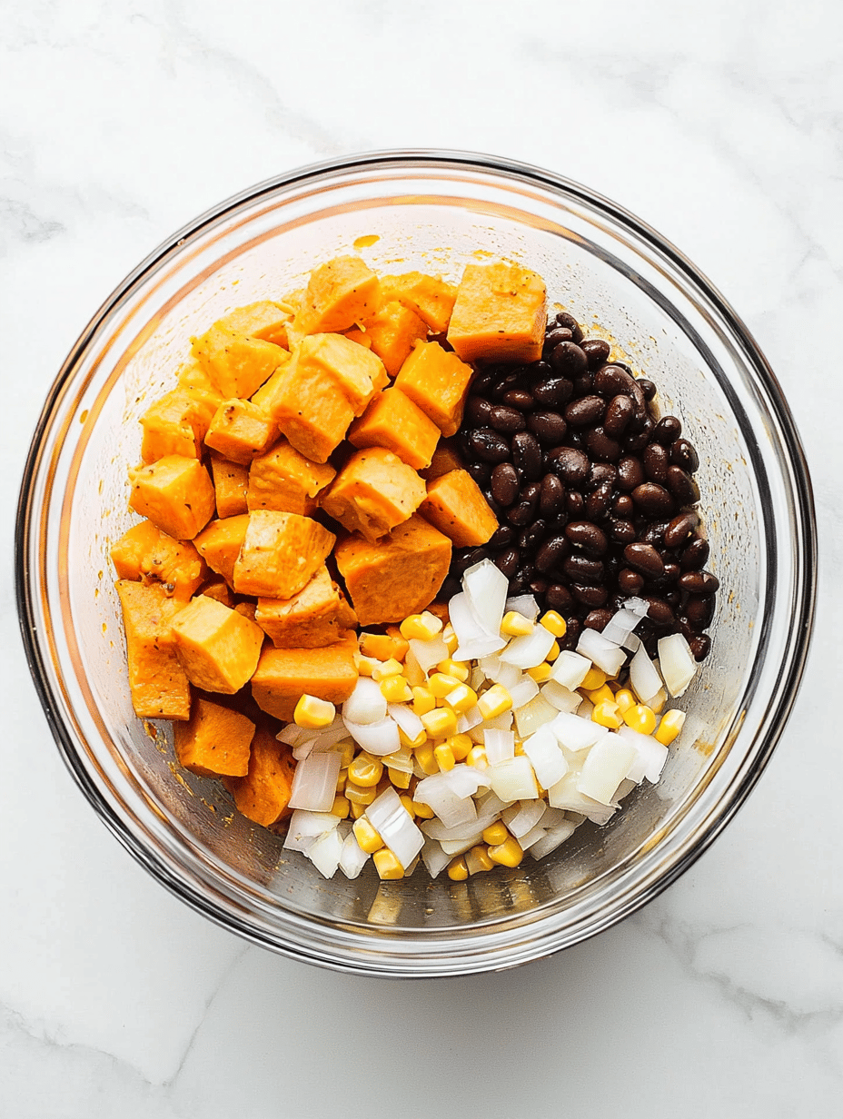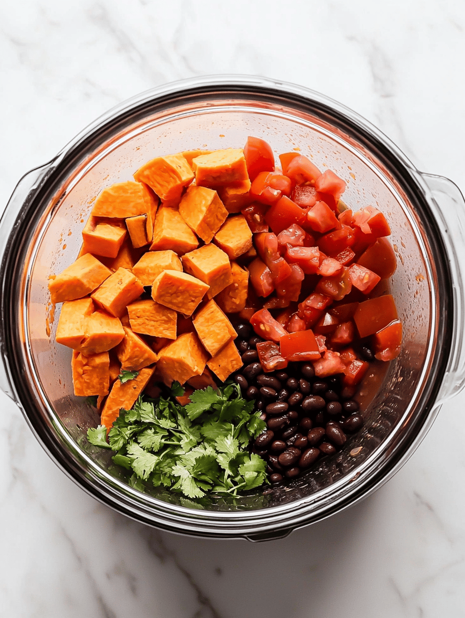In your slow cooker, add the diced sweet potatoes, drained black beans, diced tomatoes with their juice, and vegetable broth.