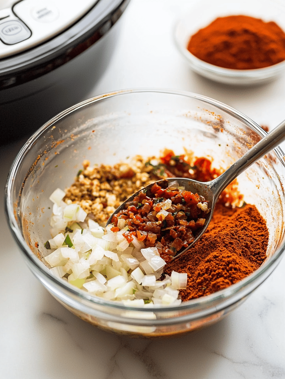 Stir in the diced onion, minced garlic, chili powder, cumin, and paprika. Mix everything well to combine the spices evenly throughout.