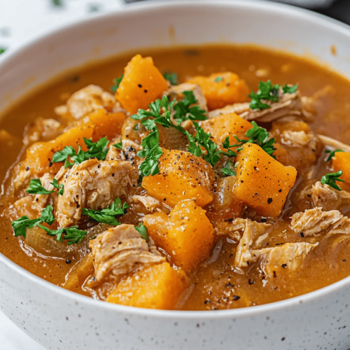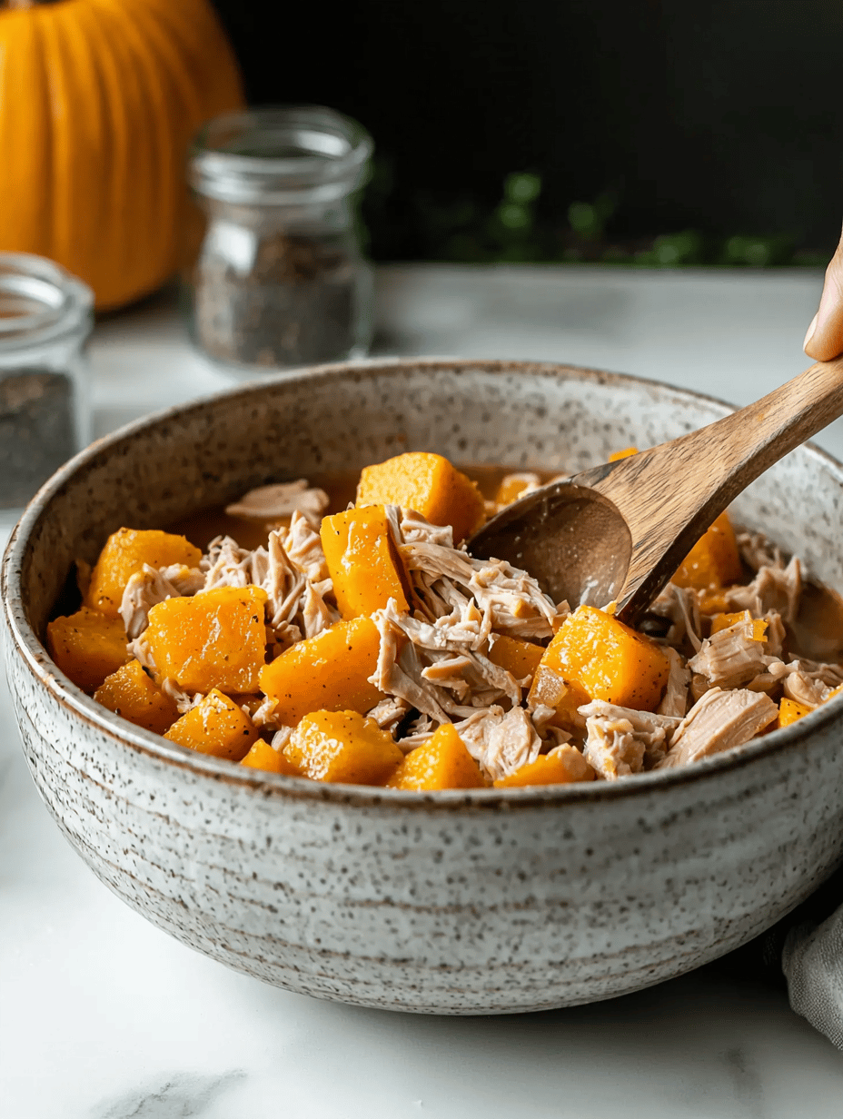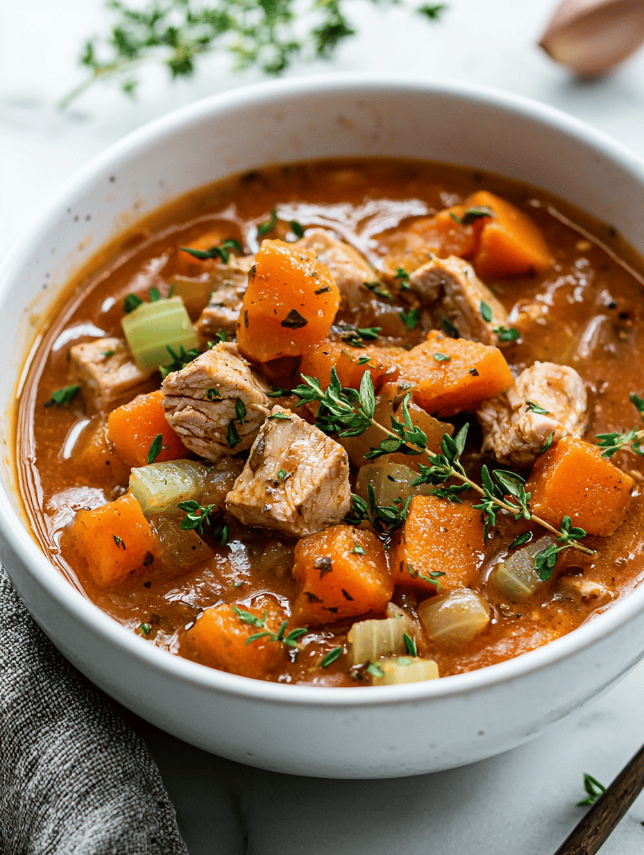 This hearty stew combines tender chunks of turkey and silky pumpkin cooked slowly to develop rich, harmonious flavors. The dish features a thick, velvety texture with aromatic spices, resulting in a warm, rustic presentation perfect for cozy evenings.