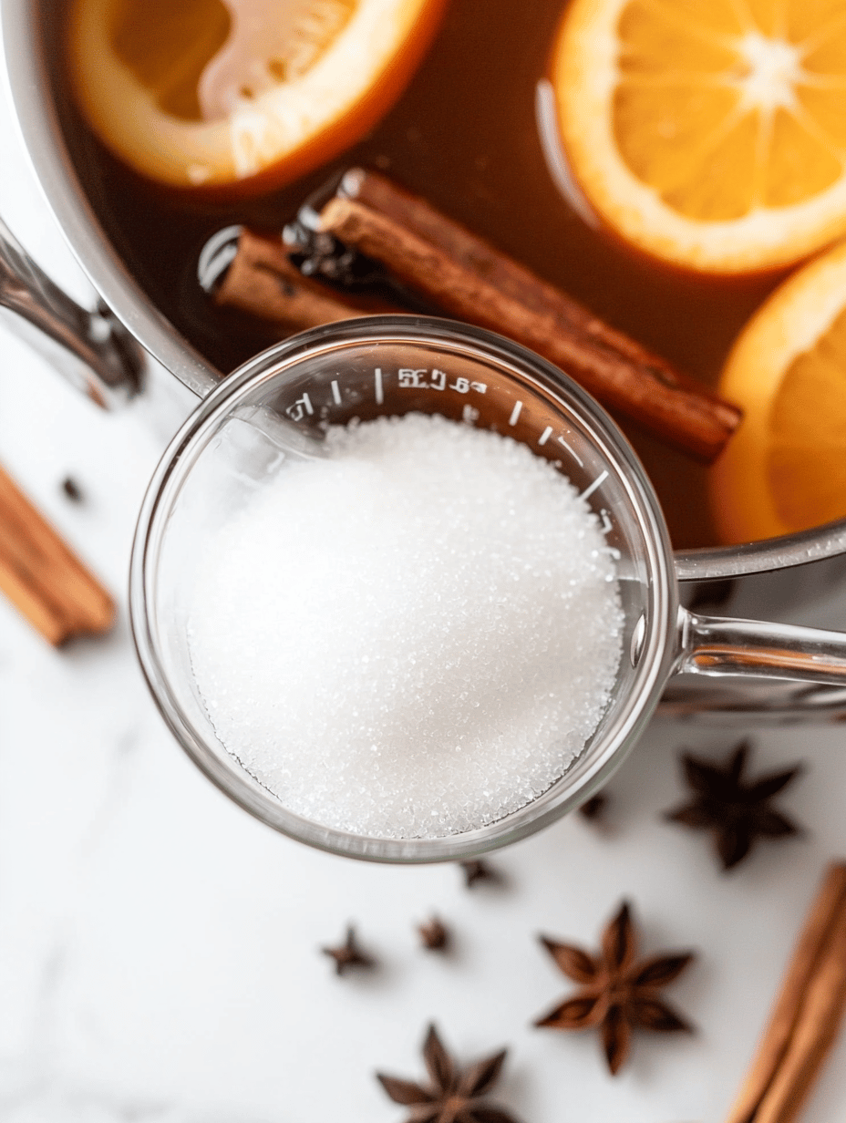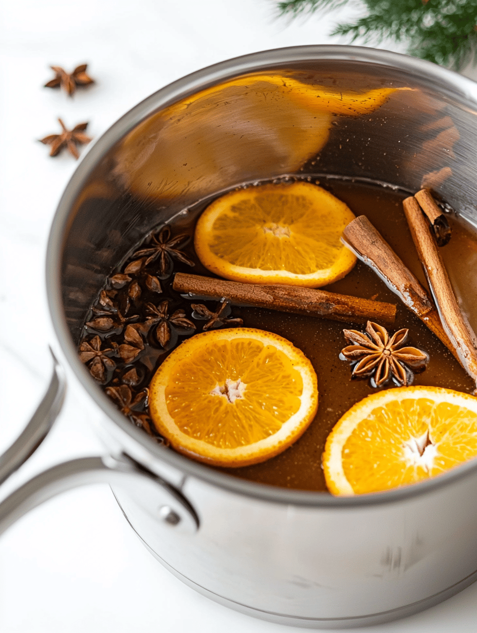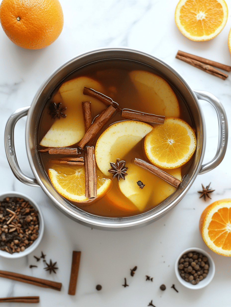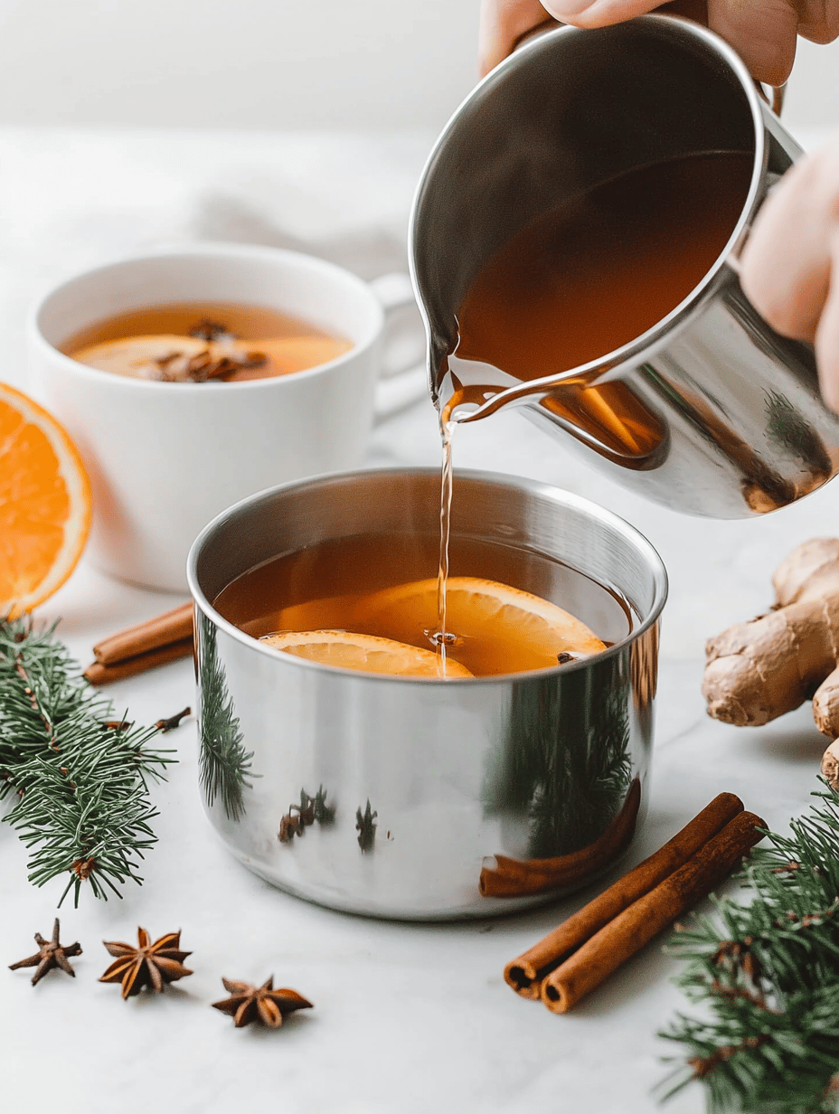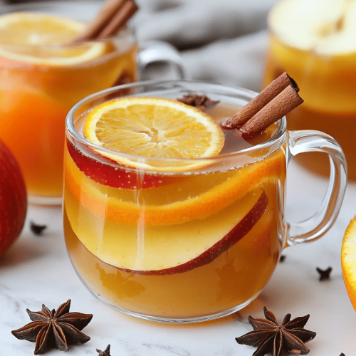This warm beverage is made by simmering apple cider with a blend of fragrant spices including cinnamon, star anise, and cardamom. The process involves gently heating the ingredients until they release their aromatic oils, resulting in a clear, fragrant, and slightly pulpy spiced cider with a rich color and inviting aroma.