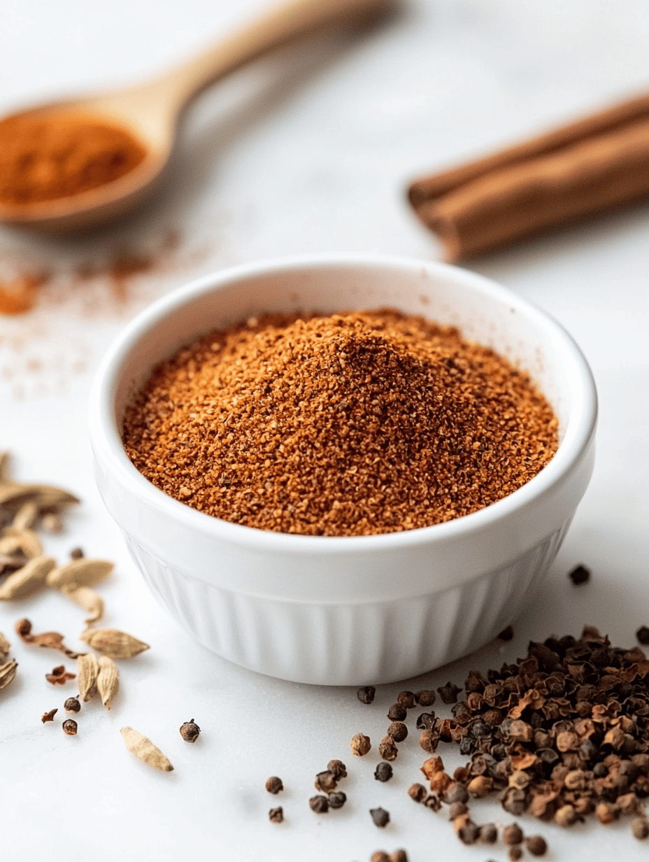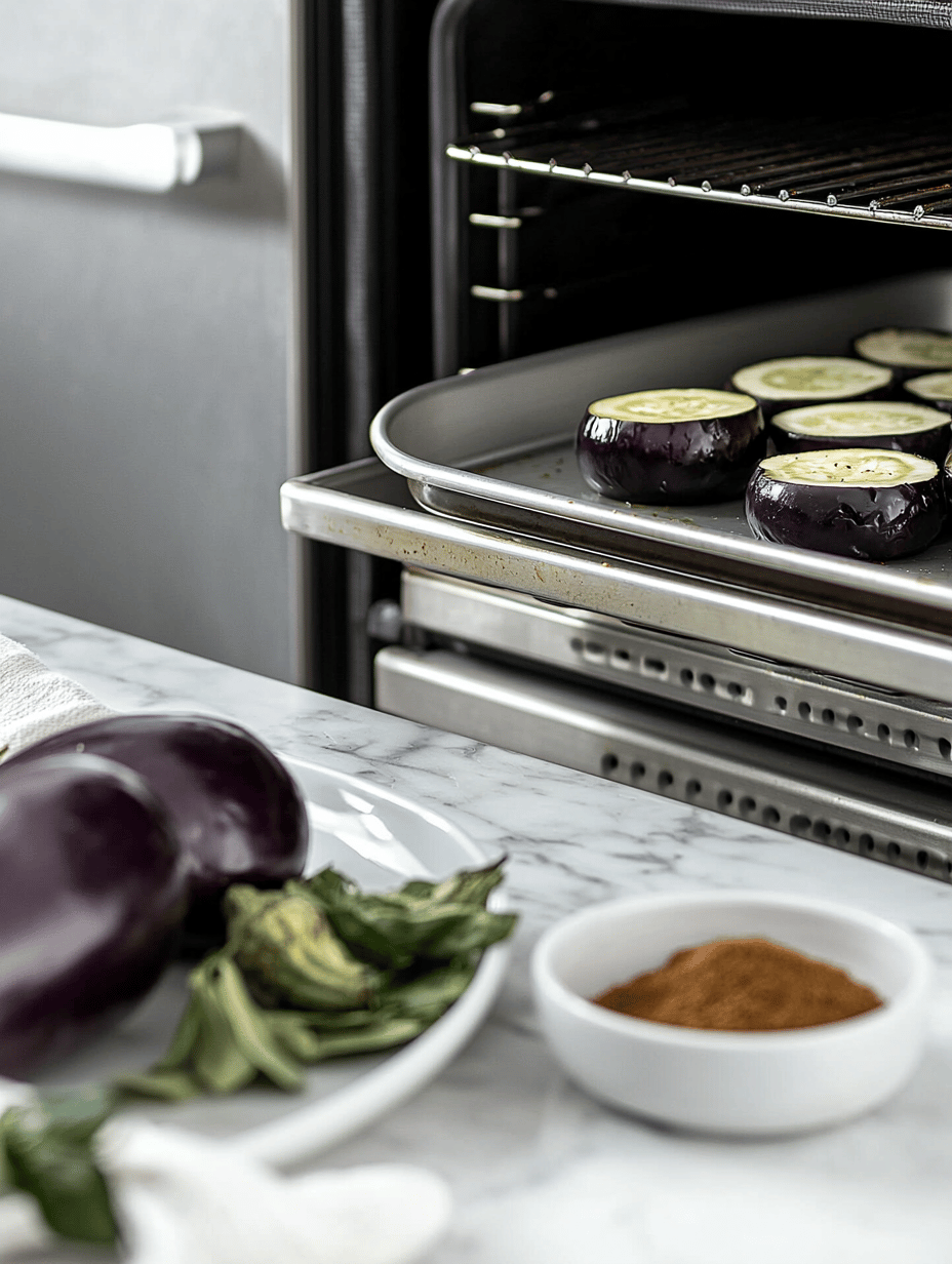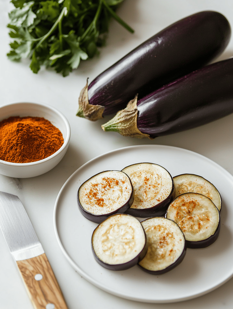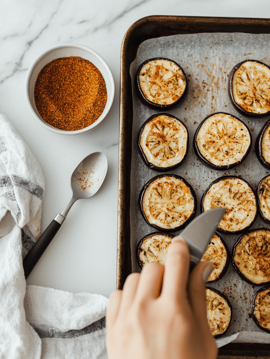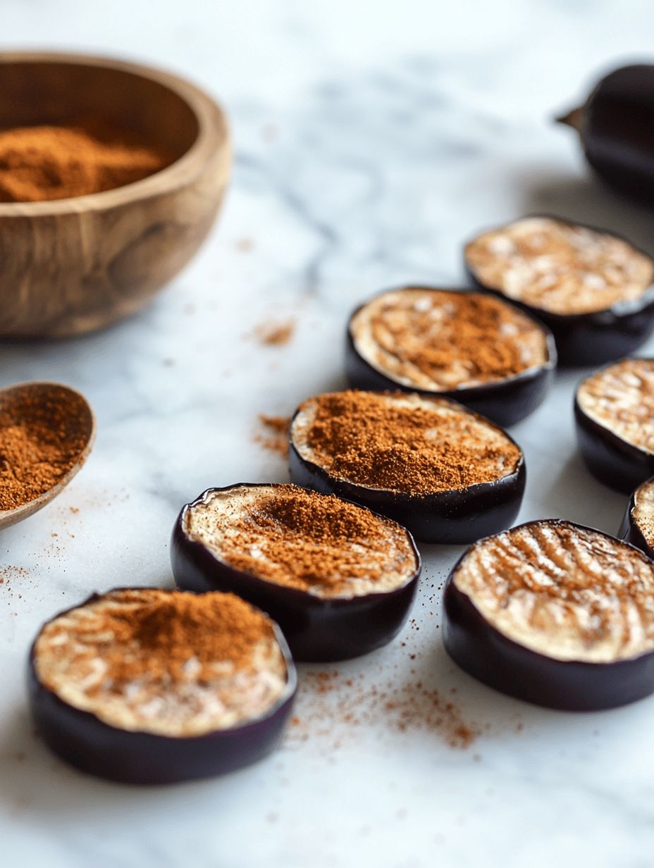 This dish features eggplant slices roasted with a bold spice blend including smoky paprika, cumin, and cinnamon. The eggplant becomes tender and caramelized on the outside, with a layered, smoky flavor, showcasing a colorful and fragrant appearance. The method involves slicing, seasoning, and roasting to develop rich textures and deep flavors.