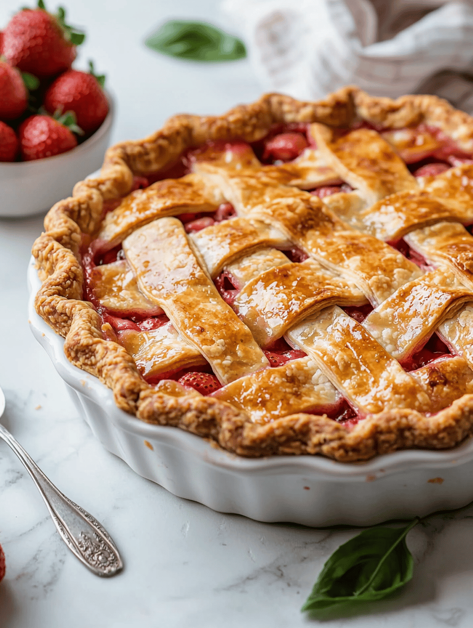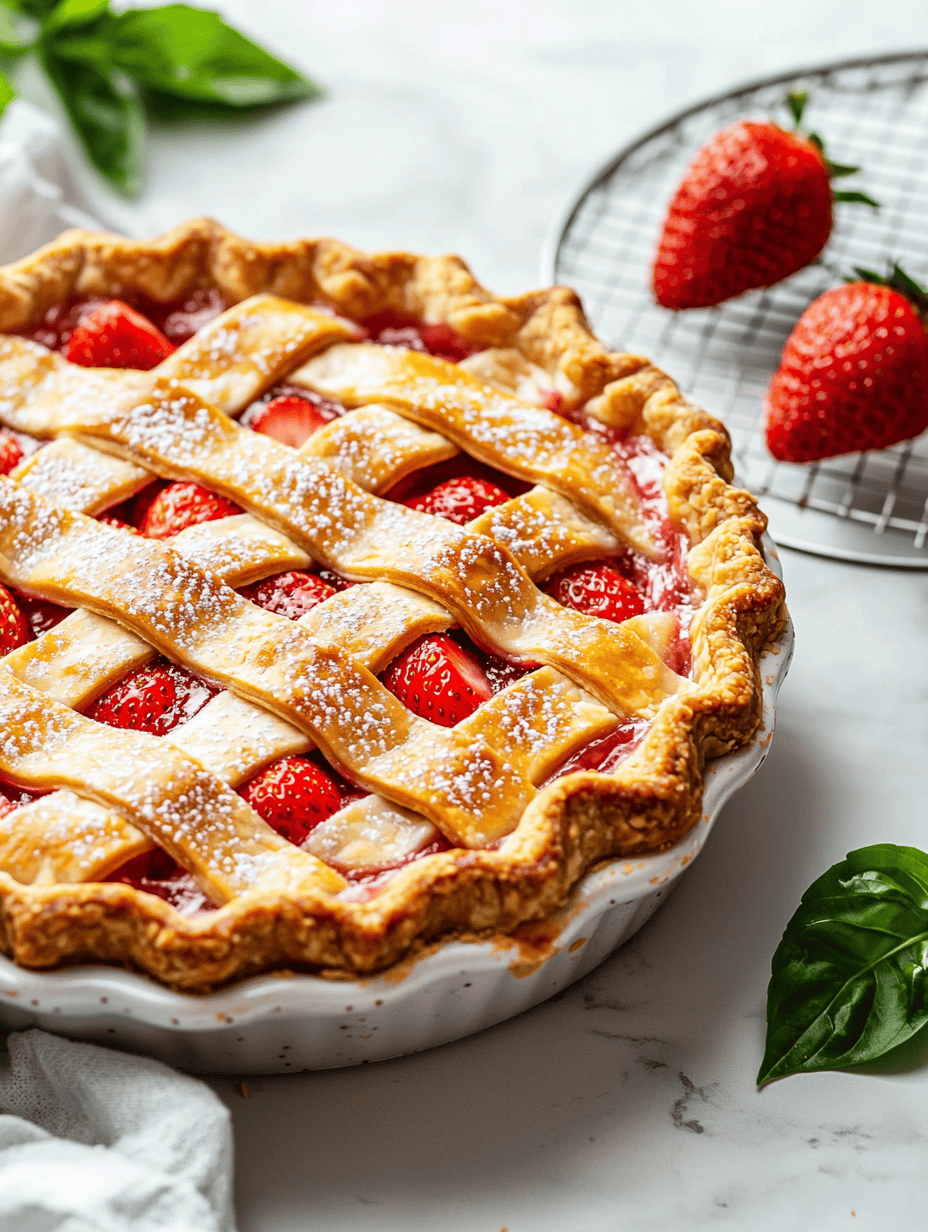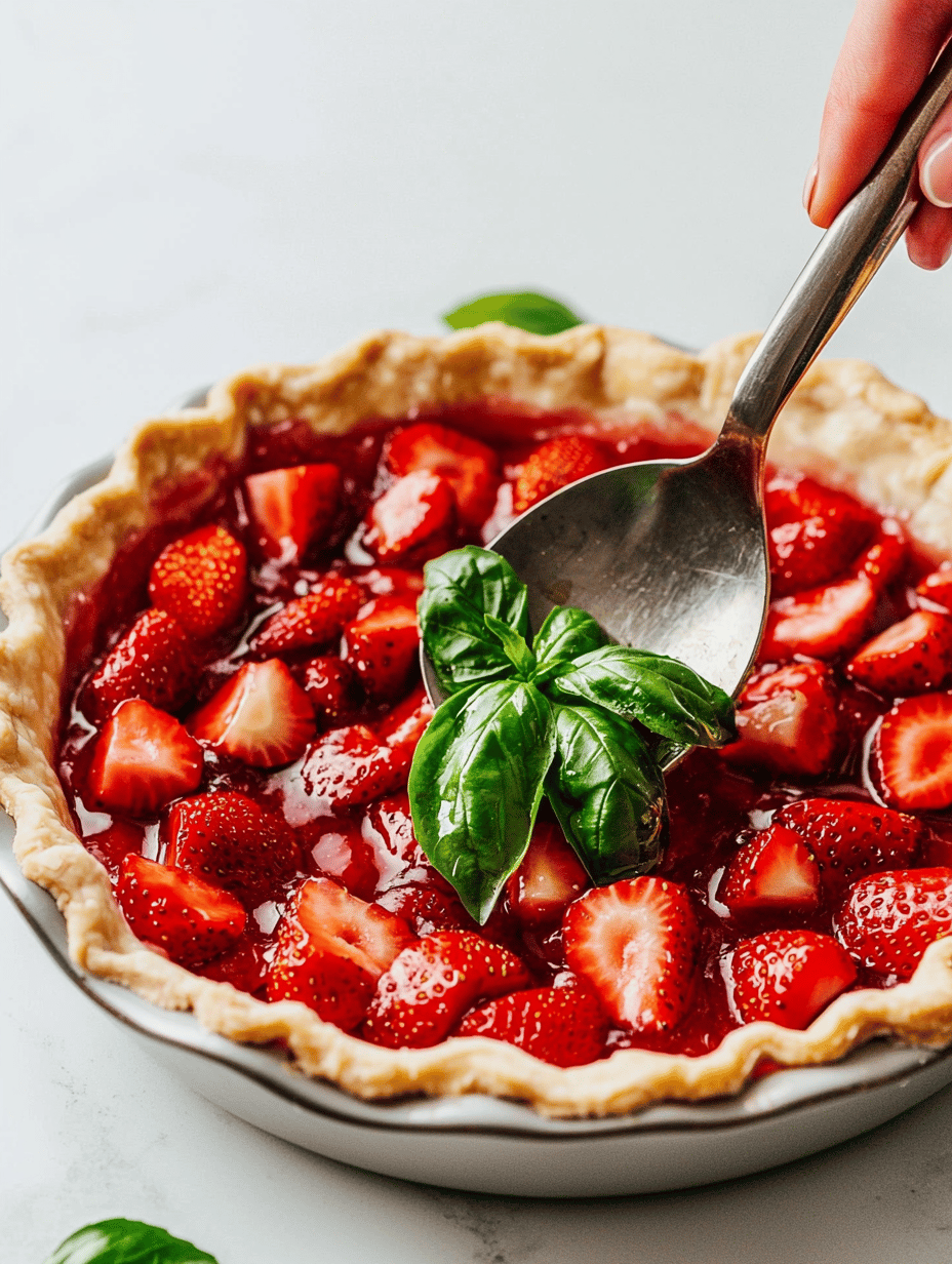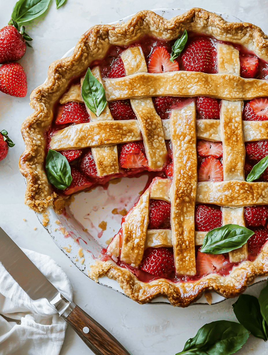 Strawberry basil pie features a flaky, buttery crust filled with a vibrant mixture of fresh strawberries, basil, and a touch of lemon. The filling is cooked until bubbly and thickened, creating a tender, jewel-toned dessert with a crisp crust and juicy interior. Its appearance is a colorful, inviting slice with bright red fruit and green basil accents.