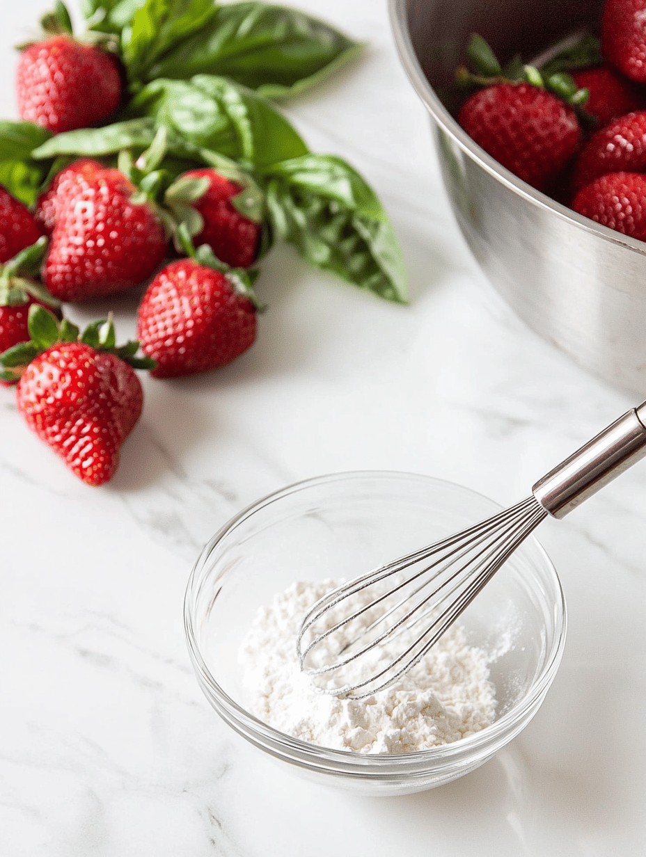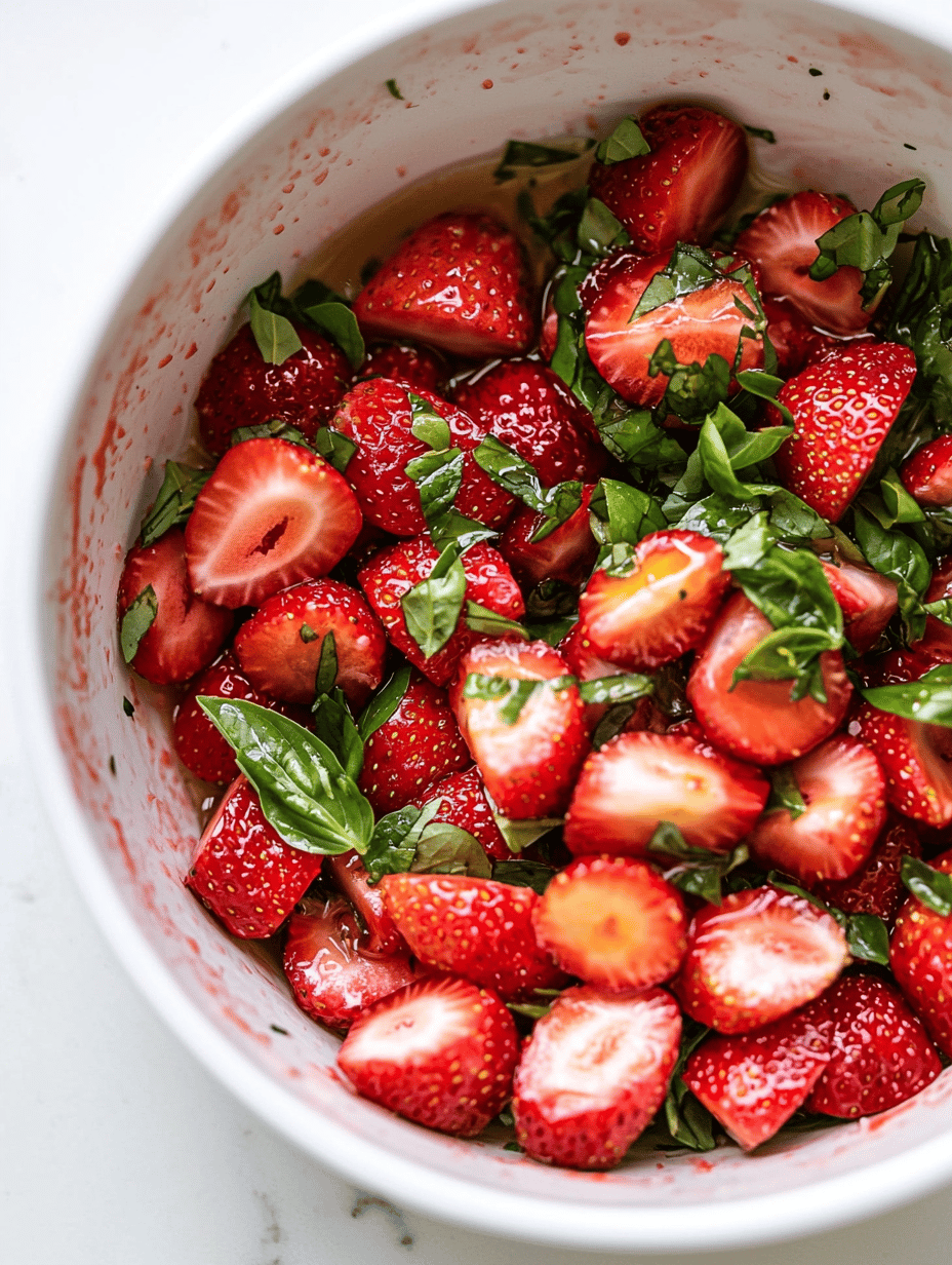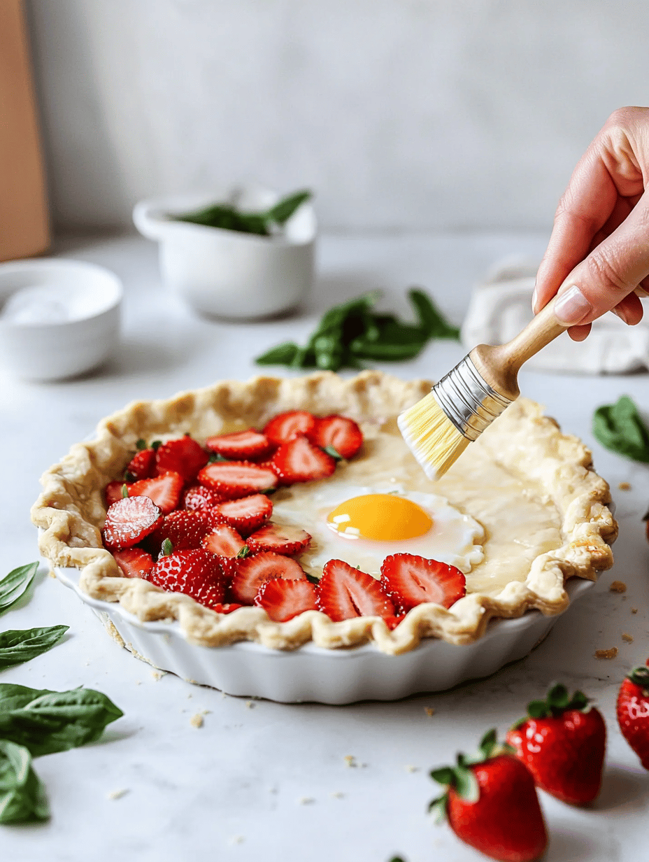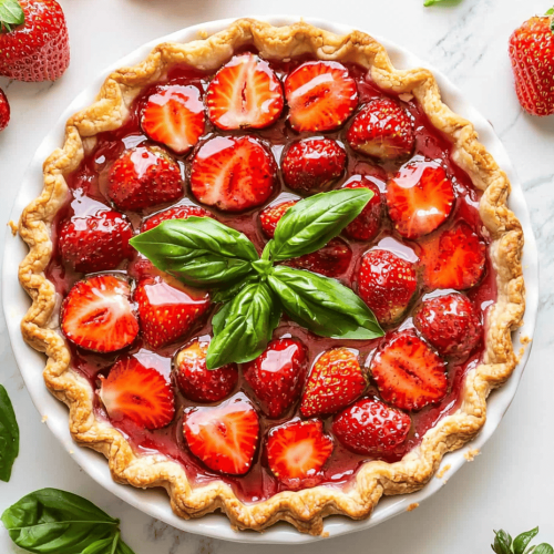 Strawberry basil pie features a flaky, buttery crust filled with a vibrant mixture of fresh strawberries, basil, and a touch of lemon. The filling is cooked until bubbly and thickened, creating a tender, jewel-toned dessert with a crisp crust and juicy interior. Its appearance is a colorful, inviting slice with bright red fruit and green basil accents.