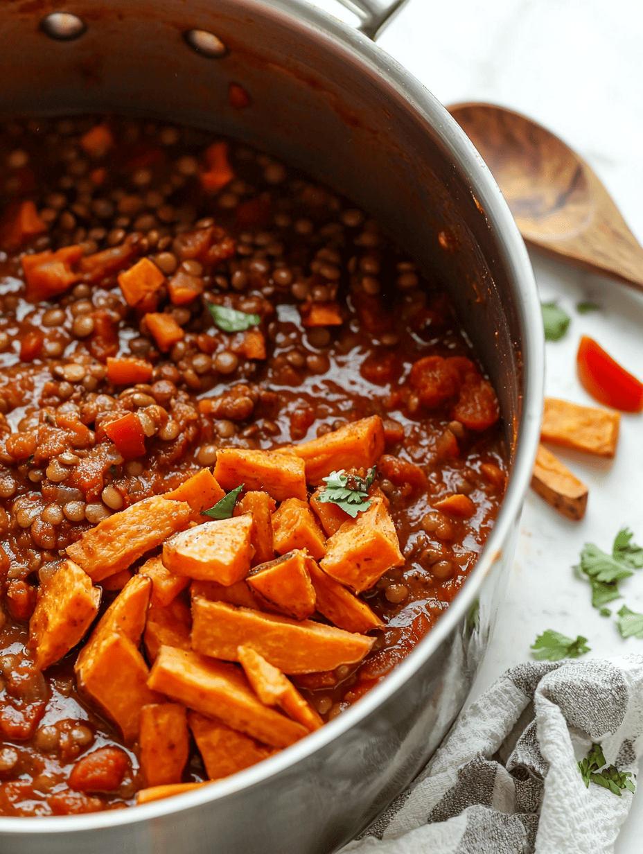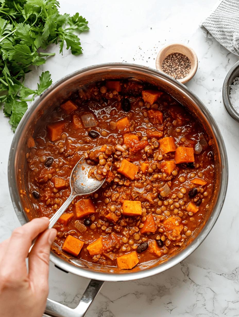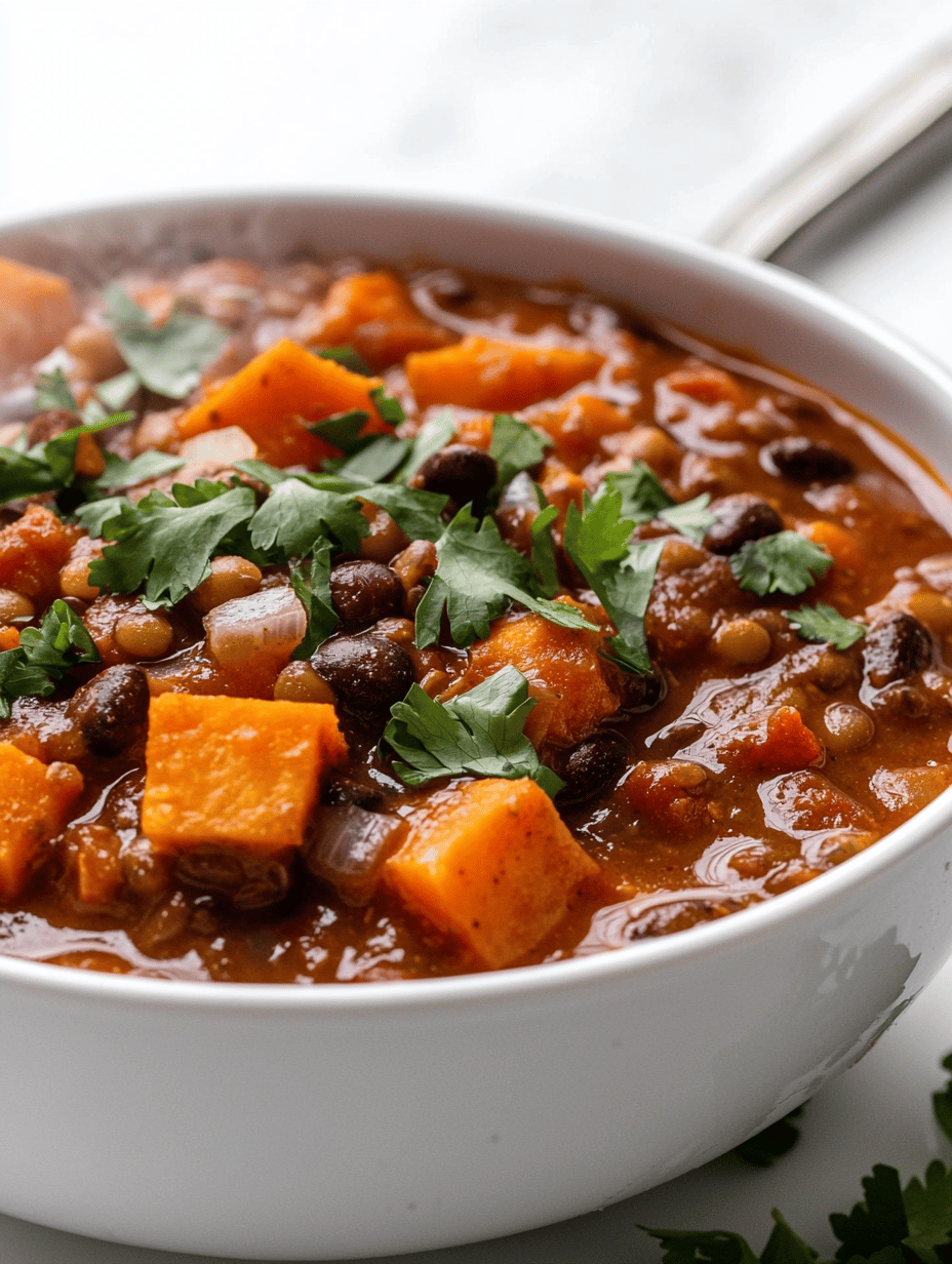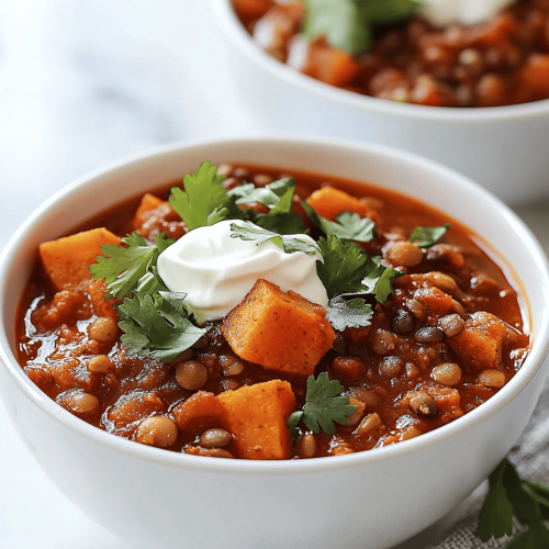 This vegetarian chili combines roasted sweet potatoes and hearty lentils, simmered until tender to create a fragrant, thick stew. The dish features a velvety texture with bits of caramelized sweetness and a rich, savory flavor profile, showcasing a vibrant bowl filled with colorful ingredients.