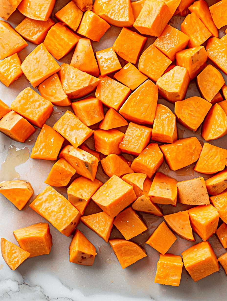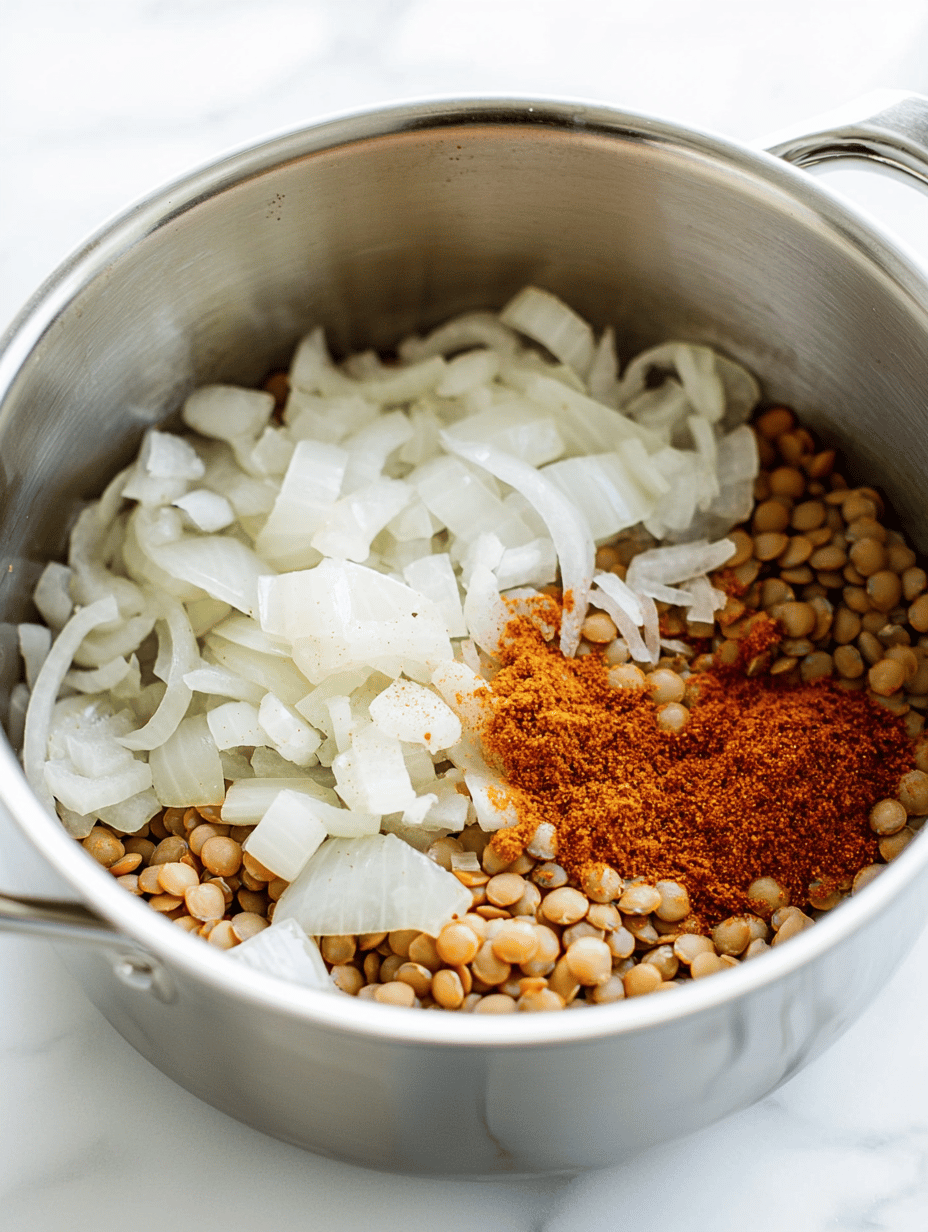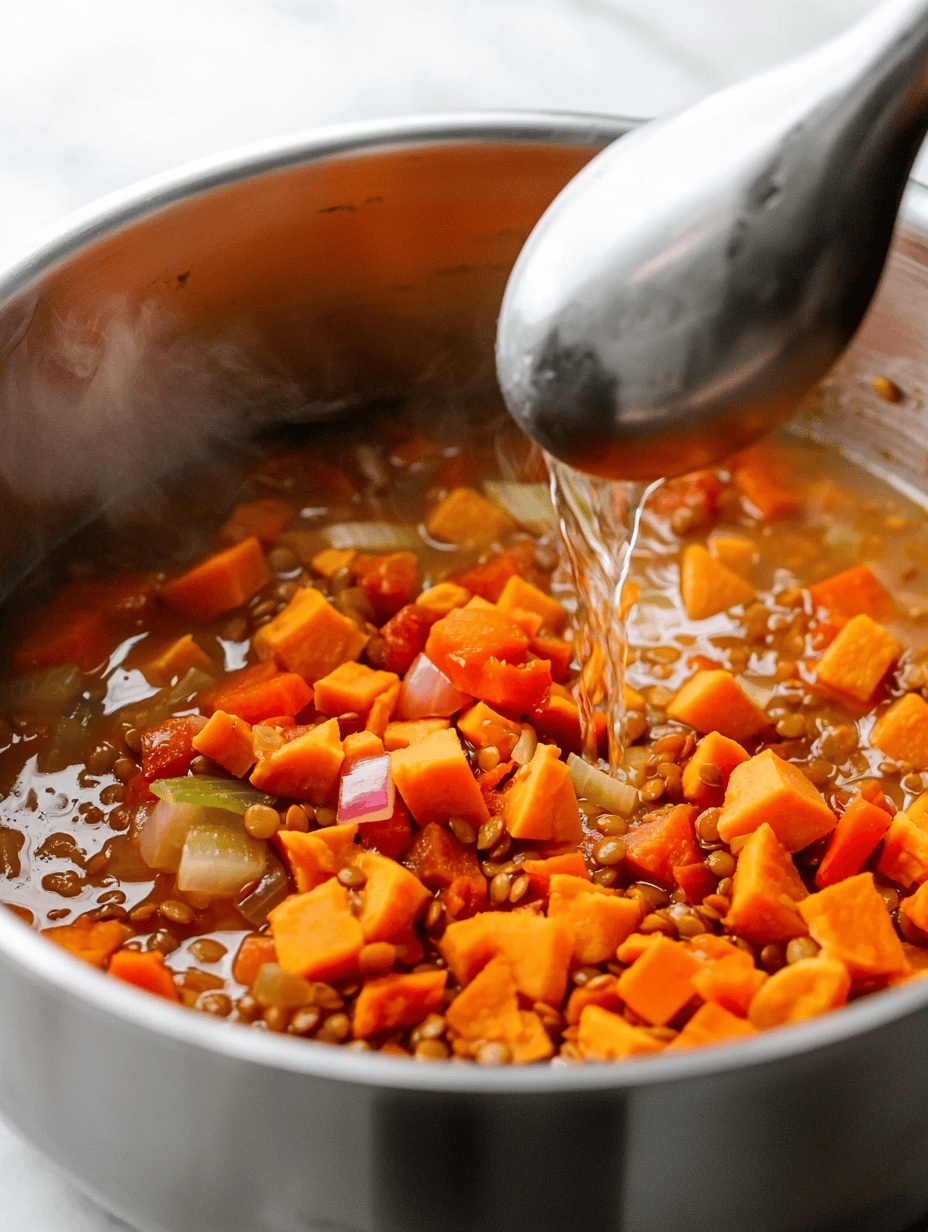 This vegetarian chili combines roasted sweet potatoes and hearty lentils, simmered until tender to create a fragrant, thick stew. The dish features a velvety texture with bits of caramelized sweetness and a rich, savory flavor profile, showcasing a vibrant bowl filled with colorful ingredients.
