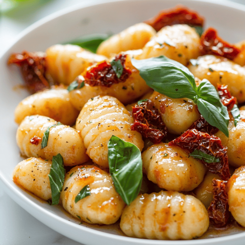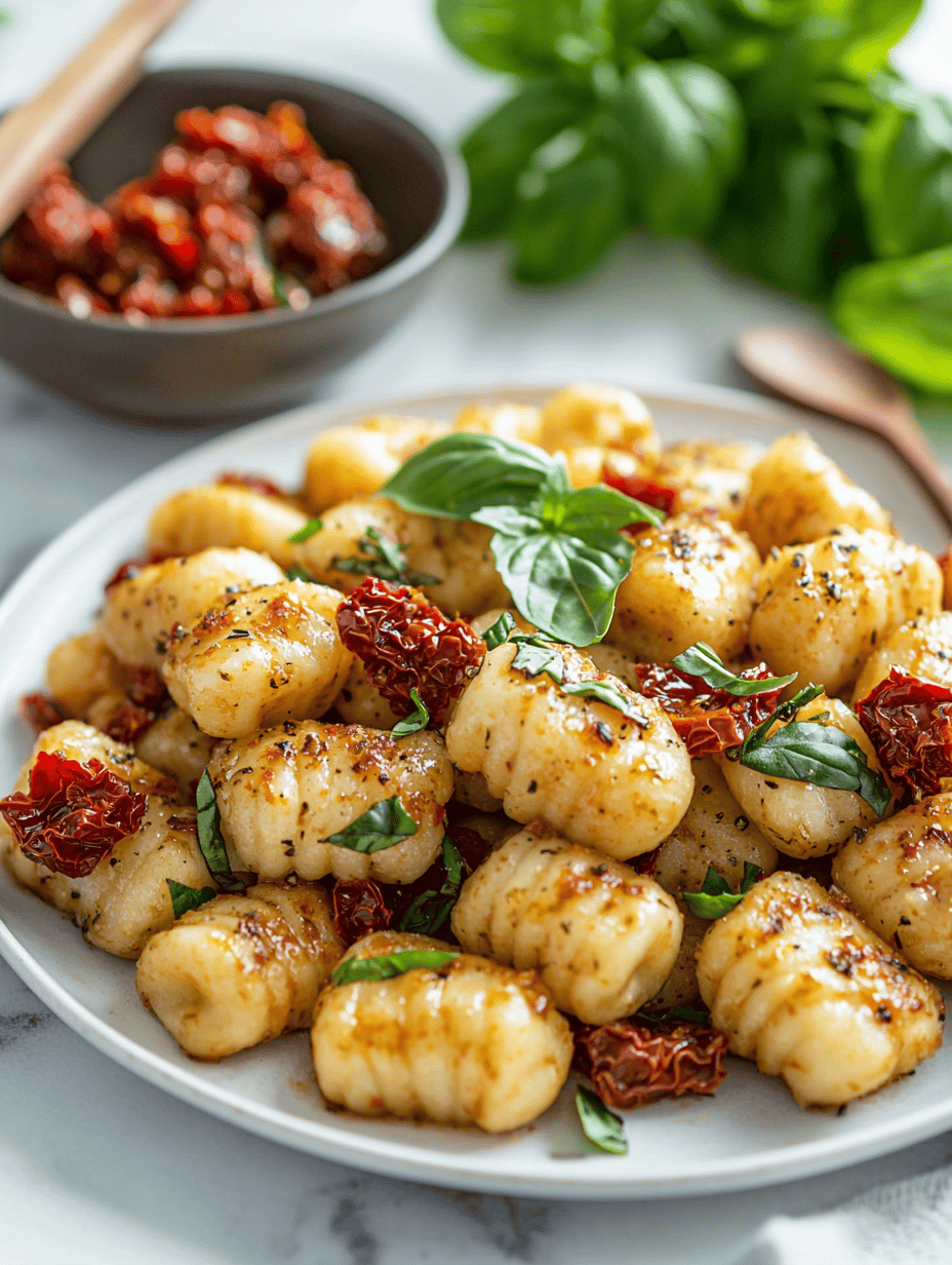 Serve the gnocchi hot, garnished with additional basil if desired, and enjoy the rustic, flavorful bites with crispy edges and tender centers.