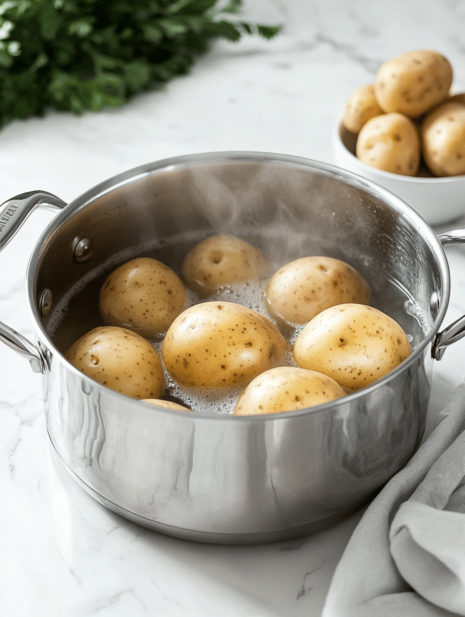 Boil the potatoes in a large pot of salted water until fork-tender and skin easily peels away, about 20 minutes. Drain and let them cool slightly.