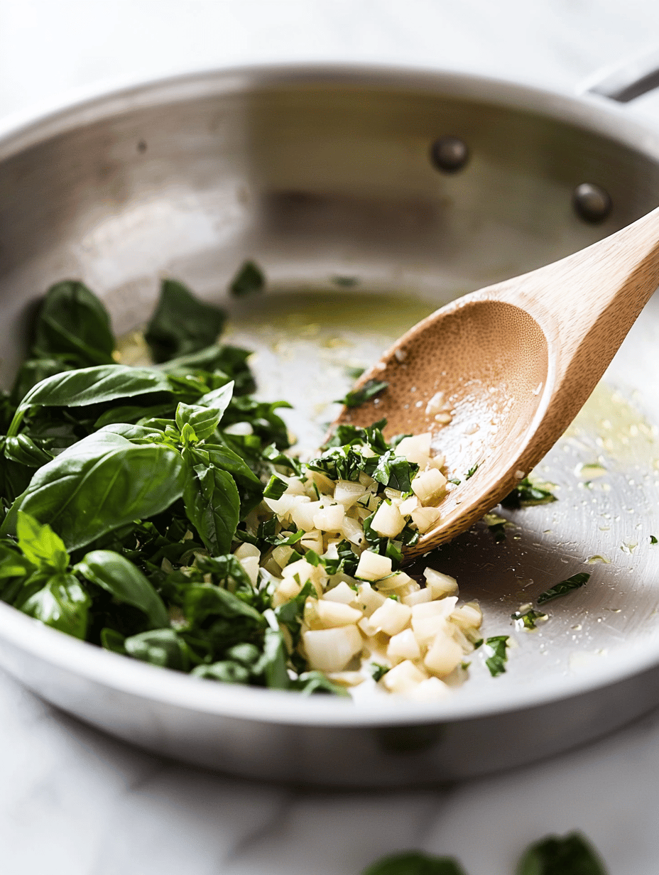 Stir in the minced garlic and chopped basil, cooking just until fragrant, about 1 minute. Toss to coat evenly.