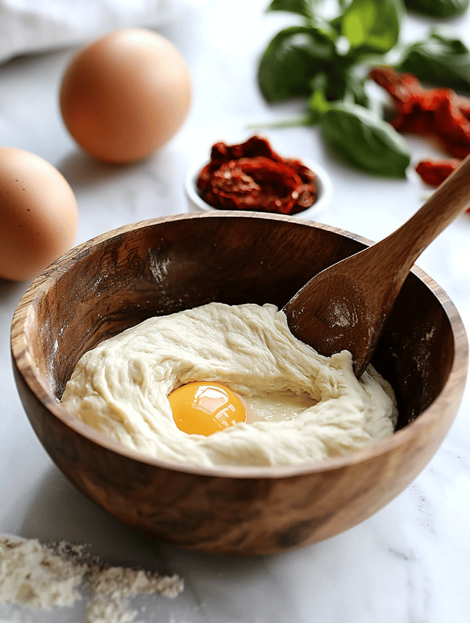 Add the beaten egg and salt into the well, then gently mix to combine.