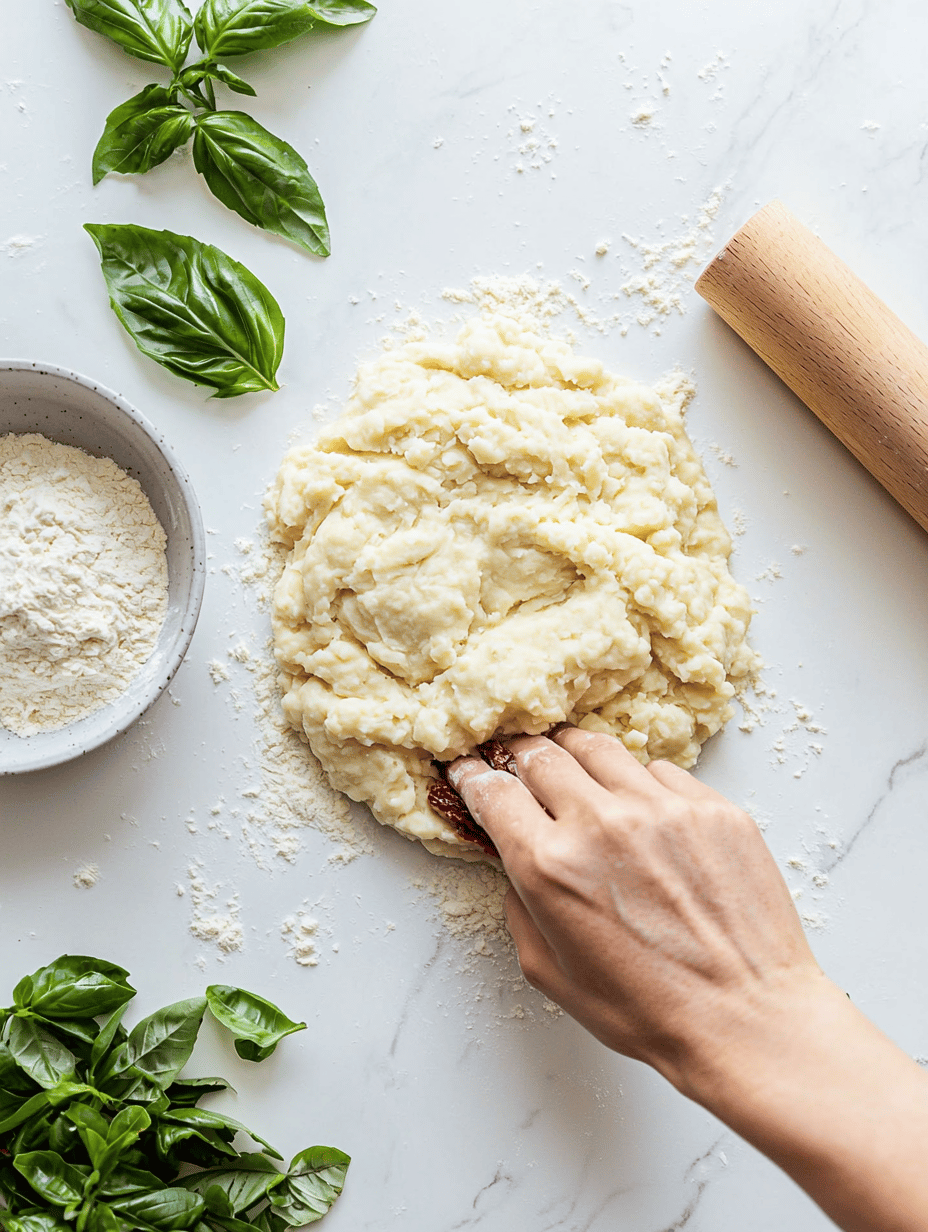 Gradually incorporate the flour into the potato mixture, kneading gently until a soft, slightly sticky dough forms.