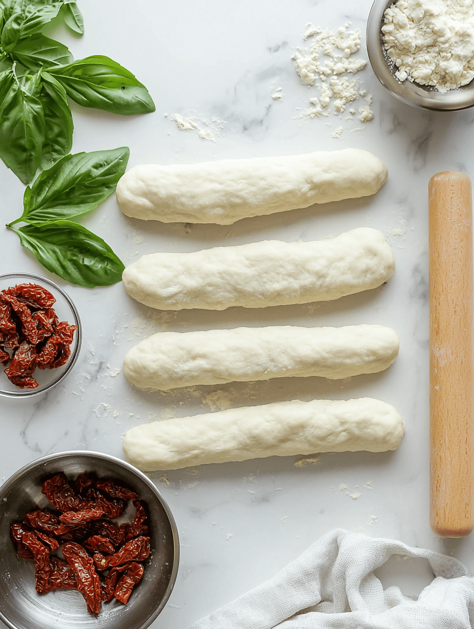 Divide the dough into 4 equal portions and roll each into a long rope about ¾ inch thick.
