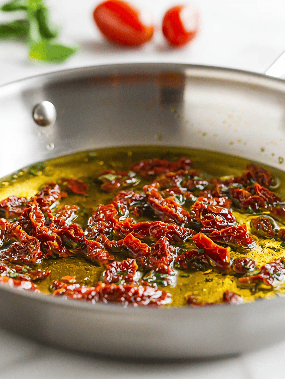 Heat olive oil in a large skillet over medium heat. Add the chopped sun-dried tomatoes and cook until fragrant, about 2 minutes.