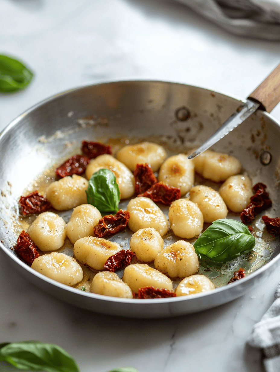 Add the cooked gnocchi to the skillet and fry until golden brown and crispy at the edges, about 4-6 minutes.