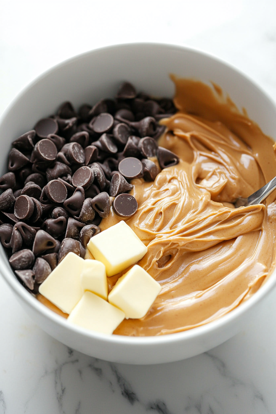 Combine peanut butter, butter, and chocolate chips in a microwave-safe bowl.