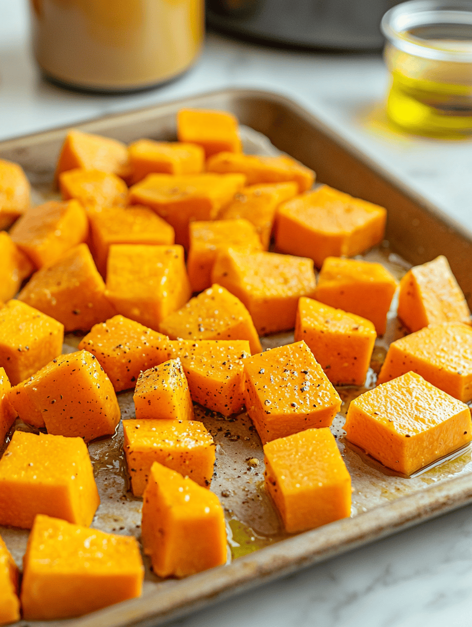 Preheat your oven to 400°F (200°C). Spread the cubed pumpkin on a baking sheet, drizzle with a bit of olive oil, and toss to coat. Roast for about 25 minutes until the edges are golden and the pumpkin is tender when pierced with a fork.
