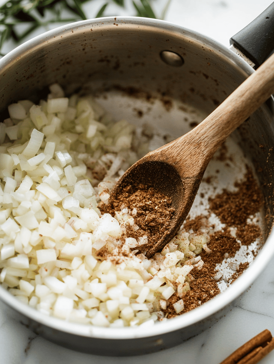 Add the minced garlic, ground cinnamon, and cumin to the onion. Stir for about 30 seconds until the spices are fragrant and the mixture is well combined.