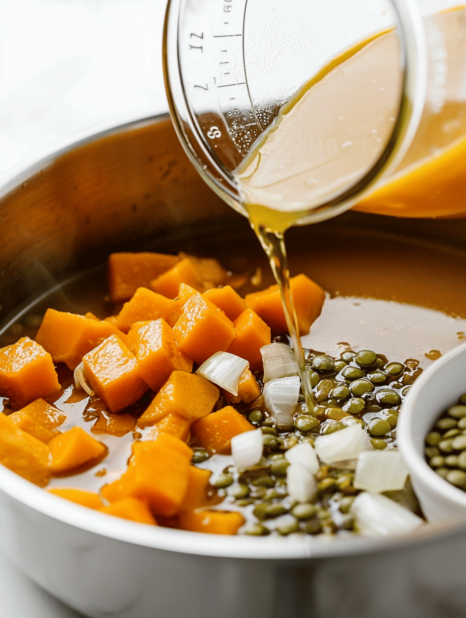 Pour in the vegetable broth and bring the mixture to a gentle simmer. Rinse the lentils and add them to the pot. Stir well, cover, and let simmer for 20-25 minutes until the lentils are tender and the flavors meld together, stirring occasionally.